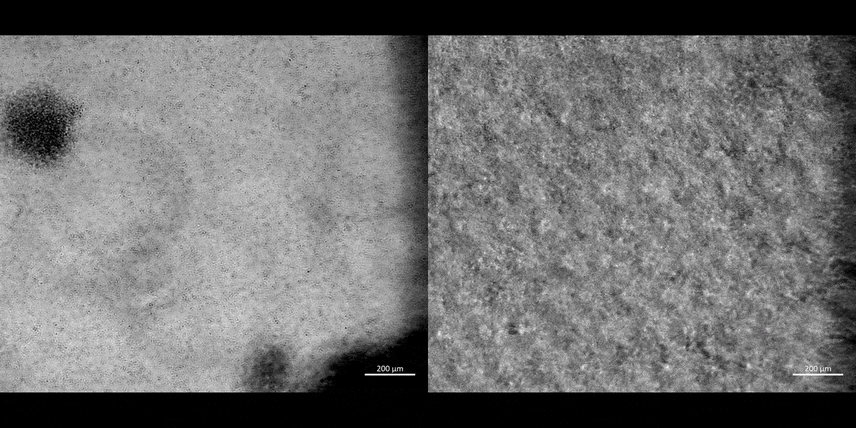 Movie 2a: Normoxia-on-a-chip/plate (fluorescence imaging): Miniature motile cluster-forming M2 anti-inflammatory macrophages trawl through the top chamber of the organ-on-a-chip instrument by day 3 of cell culture. Under normoxia the highly confluent and motile cells are active, although activated PHD2 immunofluorescence is not observed predominantly among the immunofluorescence-stained negative control cells at normoxia. Image credit: Author’s own.