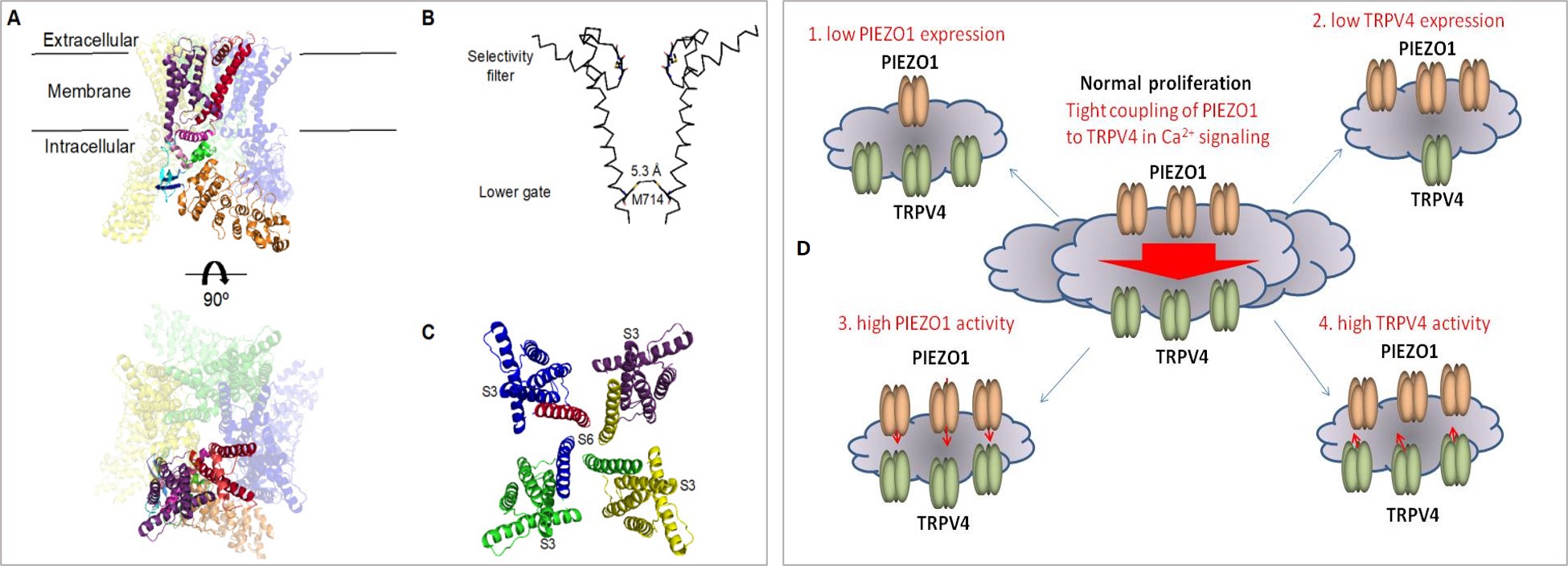 Figure 3: Cryo-EM structure of TRPV4. A) Cryo-EM reconstruction of the tetrameric channel, b) orthogonal views of the overall structure, c) structure of a single subunit, d) schematic representation of the Piezo1 and TRPV4 interaction dynamics during mechanosensory ion channel transduction involved at downstream calcium signaling. Credit: [Yoneda 2019, Deng 2018].