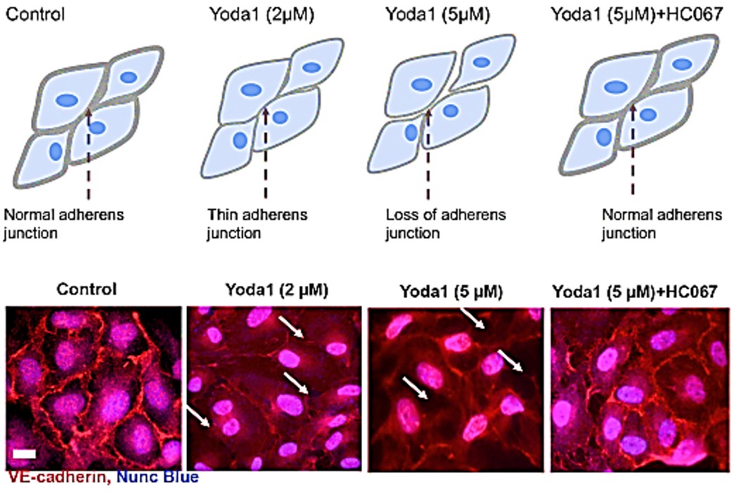 Functional assays have already shown that administering the Piezo1 agonist Yoda1 caused cell retraction to produce paracellular gaps at adherens junctions via cell surface area reduction, through beautifully rendered experimental detail (movie 1) (Figure 6) [Swain 2021]. Administering the TRPV4 blocker HC067 can prevent cellular disruption caused by the Piezo1 agonist Yoda1, to confirm the combined pathological associations of the two mechanosensory ion channels in vivo.