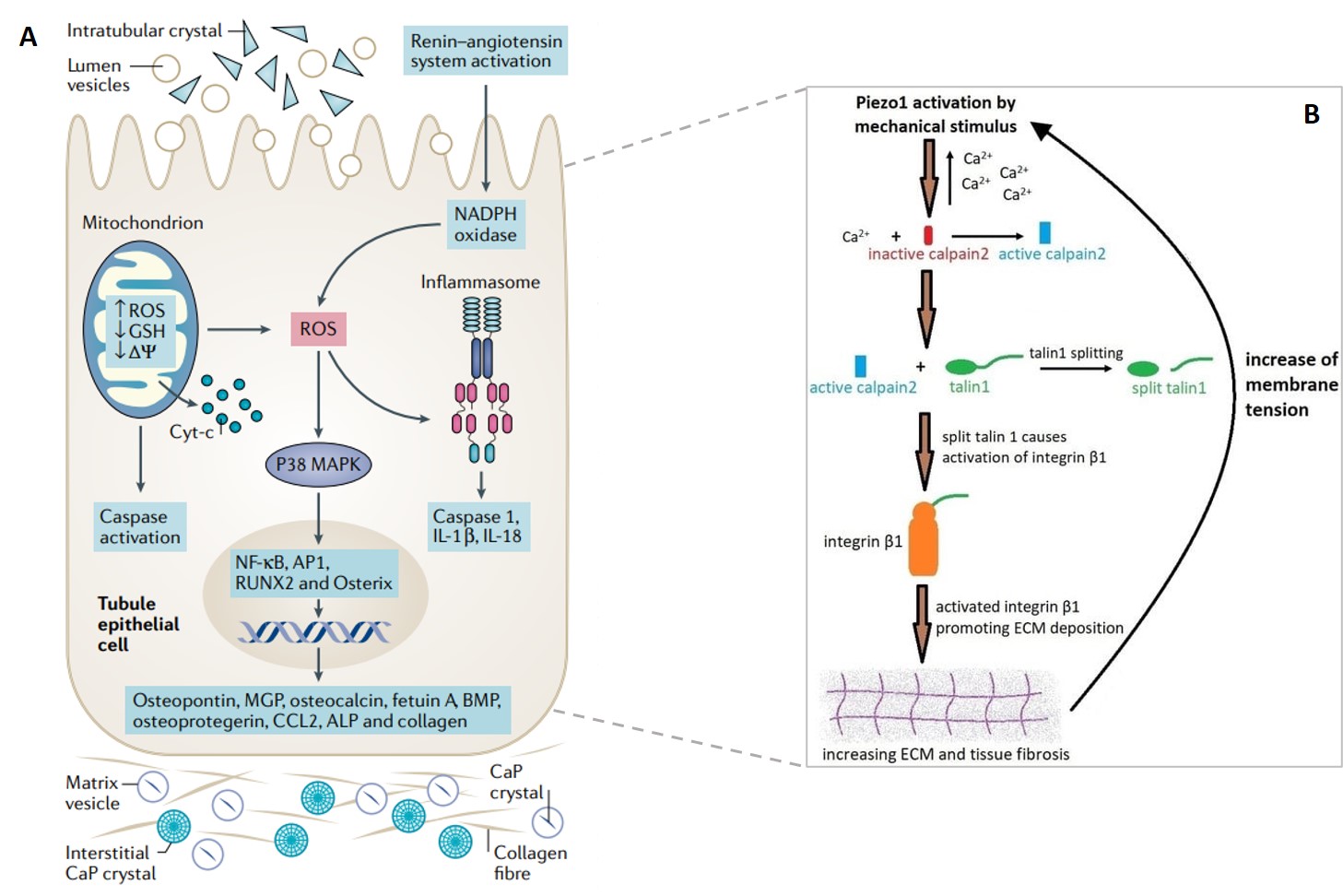 In a nutshell, the mechanosensors of Piezo1 and TRPV4 activate during high shear and pressure-induced mechanotransduction to increase intracellular calcium and trigger endothelial dysfunction and fibrosis. These ion channels also react to increasing microenvironmental stiffness that accompany calculi formation – in a positive feedback loop (Figure 5b).