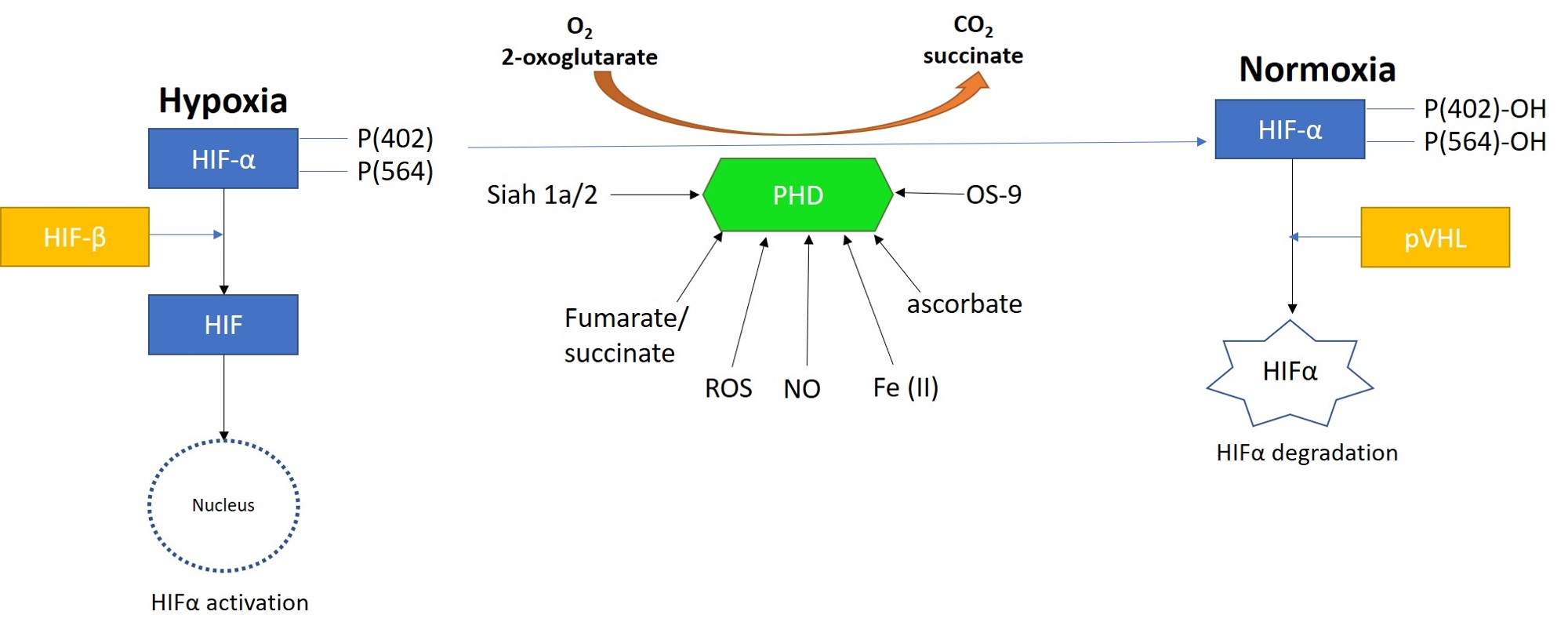 Figure 10: Prolyl hydroxylase domain 2 (PHD2) is a key oxygen sensor in mammals that post-translationally modifies hypoxia-inducible factor α (HIF1α) to target it for degradation by forming a complex with the Von Hippel-Lindau factor (pVHL). Reactive oxygen species, nitrous oxide, osteosarcoma amplified 9, ascorbate, succinate, iron, and protein ligase components can regulate the function of PHDs. Figure credit: Author’s own.