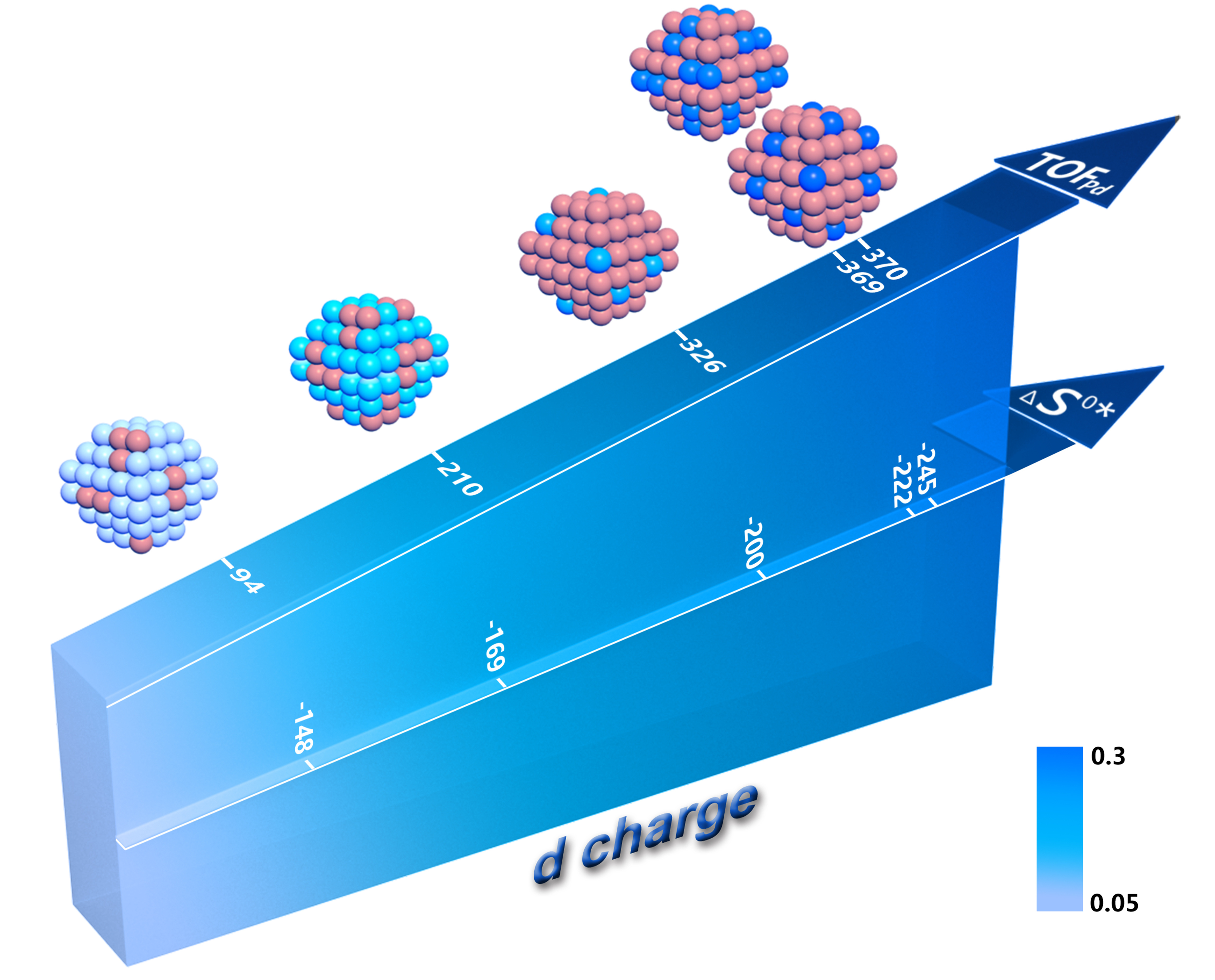 The well-defined nanoalloy structure, in particular, continuous change of the Pd-Au coordination numbers in AuPd catalysts with different Pd loadings, allows for a direct determination of the structure-property relationship. The d-band and non-d (sp, mainly s) charge densities at Pd sites are easily measured by experiment: the measured binding energy shift of the core level between the pure metal and the alloy relative to the Fermi level is correlated with the changes of the Hartree-Fock one-electron energy of the core level which is directly dependent on the charge transfer in the initial ground state, the change in the work function, and the final-state relaxation of a core hole between the metal and the alloy. The maximum d-charge gain is found on Pd single atom and Pd-Pd dimer with about 33–50 at% Pd. Based on transition state theory, the d-charge gain on the surface Pd site has a positive correlation with the standard entropy change (ΔS0*) of active complexes, and turn-over frequency (TOFPd) with a typical example for the base-free oxidation of primary alcohols. The decisive influence of the d orbital which is not involved in metal bonds in a hybrid orbital on the stabilization energy of adsorbed complexes and catalytic activity, is well clarified.