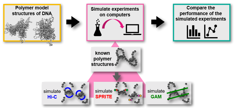 As physicists interested in the three-dimensional (3D) organization of DNA in cells, we are used to testing polymer physics models over experimental data and then interrogating those models for novel insights. So, it was quite a challenge for us to tackle a project where that typical routine had to be reverted: using polymer models of DNA to benchmark experimental methods able to measure the 3D organization of the genome. To do so, we realized simulations of this kind of experiments on computers, with DNA represented by validated polymer models [7,10]. In this way, since all is known of polymer model structures, we could test the performance of various simulated experiments in many conditions, and in the controlled environment of a computer simulation. We thought of it as a virtual playground for experimental methods aimed at capturing the DNA organization in space.