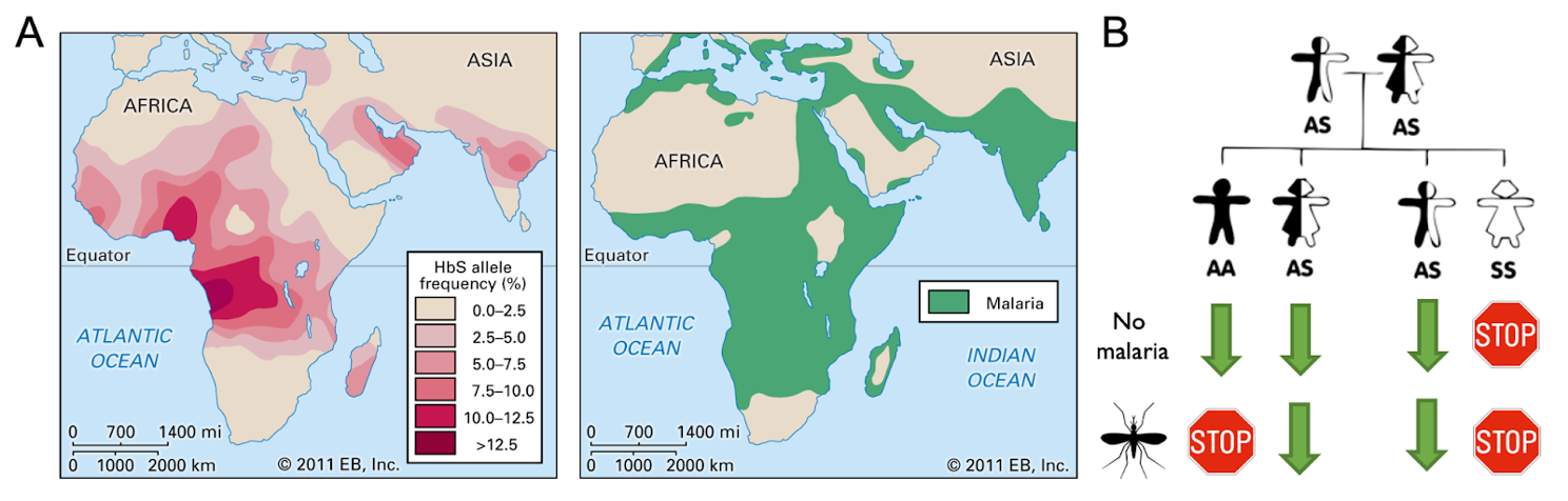 Figure 1: A) Map showing regional sickle cell disease (HbS) allele frequencies (left panel); map showing regions most heavily impacted by malaria (right panel; adapted from Encyclopedia Britannica). B) Example of genetic outcomes resulting from two sickle cell disease carriers. Expected selection pressures applied in the context of regions with and without malaria. Stop sign indicates selective disadvantage; green arrow represents selective advantage.