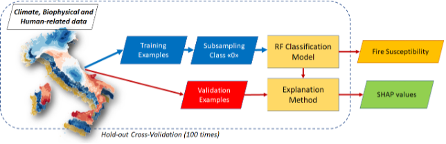 Methodological overview. Environmental, biophysical, and human-related variables are used to model wildfire occurrence over the Italian peninsula. In addition, the computation of the SHAP values provide a disentanglement of the single contribution to the overall fire occurrence probability predicted by our Random Forest classifier.