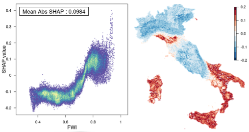 Left panel: Partial dependence plot generated by comparing the Fire Weather Index (FWI) observations with their related SHAP values. Right panel: Spatial distribution of the Fire Weather Shapley values.