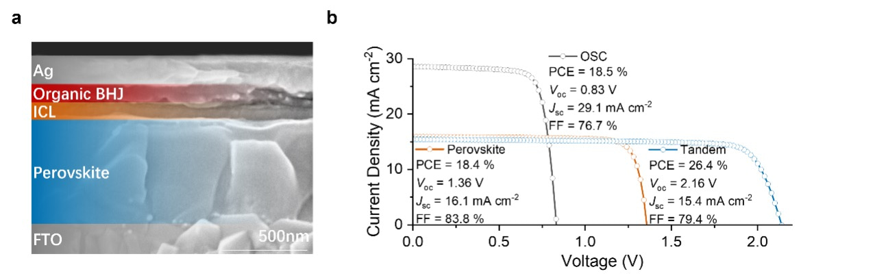 Due to the different passivation mechanisms, the WBG pero-SCs treated with cis-CyDAI2 exhibited reduced interfacial energy loss. In a 1.88 eV wide-bandgap perovskite single-junction cell, we achieved an open-circuit voltage of 1.36 V. Eventually, we constructed a perovskite/organic TSC (Fig. 2a) using the low-energy-loss WBG perovskite as the front cell and a narrow-bandgap organic solar cell as the rear cell, achieving a PCE of 26.4% with a certified value of 25.7% (Fig. 2b), which is the highest reported PCE for the perovskite/organic TSCs.