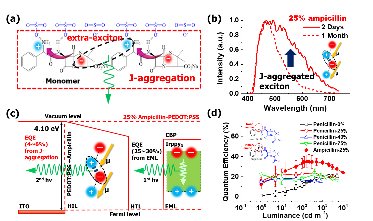 The specific molecular structure of ampicillin was found to be very interesting for the device performance in terms of enhancement in optical and electronic properties. The explicit charge distribution over the ampicillin monomer due to the presence of amine (-NH2) and carboxylic group (-COOH) presented the presence of an interfacial dipole (Fig. 1a) with a high magnitude (30.28 Debye). Interestingly, when the ampicillin was added in PEDOT:PSS with various concentrations (25, 40 and 75%) the changes in the pH resulted in different interactions of ampicillin with the polymer matrix. At 25% concentration, the monomers were stable and aligned themselves in a horizontal fashion to form J-aggregations (Fig. 1a, b) and the resultant interfacial dipole presented a decrease in the work function. The J-aggregated excitons contributed to the device efficiency by formation of additional excitons (Fig. 1c) while, the decrease in work function provided a charge balance in the device. As a result, the highest external quantum efficiency of ~35% (Fig. 1d) was obtained with 25% addition of ampicillin in the OLED devices.