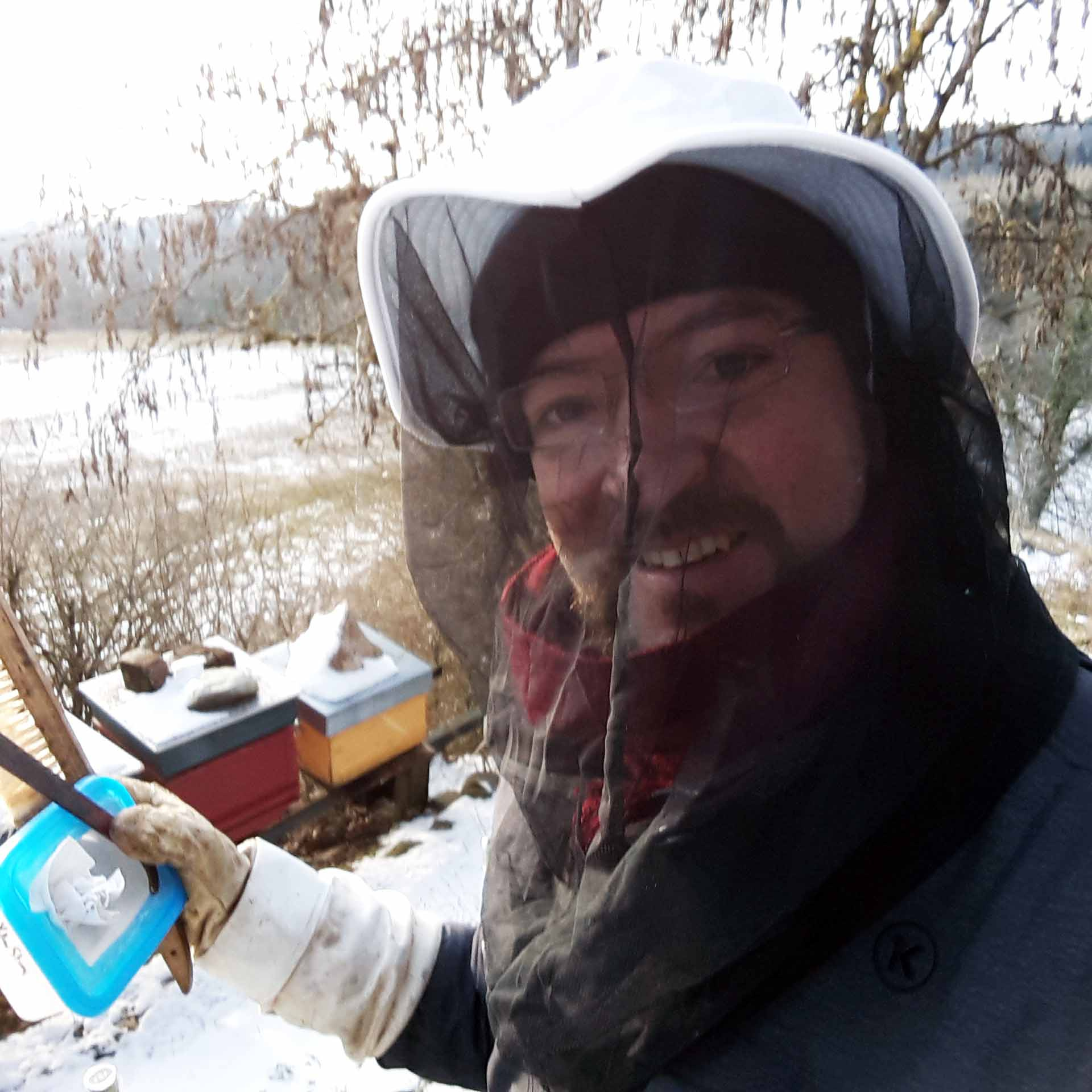 Olivier Emery with his hives right after sampling the last batch of winter bees in January 2018 (photo: O. Emery).