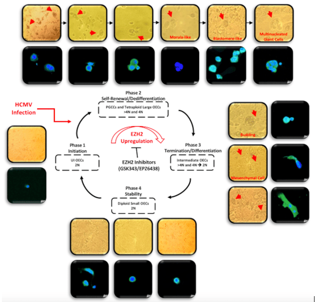 Figure 1. A schematic representing the giant cell cycling following HCMV infection of OECs. Giant cell cycle representing four distinct phases including initiation, self-renewal, termination and stability. Upon HCMV infection, the 2N OECs go into the initiation phase through endoreplication. Polyploid cells (>4 N) and tetraploid cells (4N) generate in the self-renewal/dedifferentiation stage due to HCMV infection and the subsequent EZH2 upregulation. Cell budding takes place from multinucleated or mononucleated giant cells generating intermediate 2–4 N OECs during the termination/differentiation phase. Intermediate OECs gradually reach stability and are converted into diploid small OECs (2N).