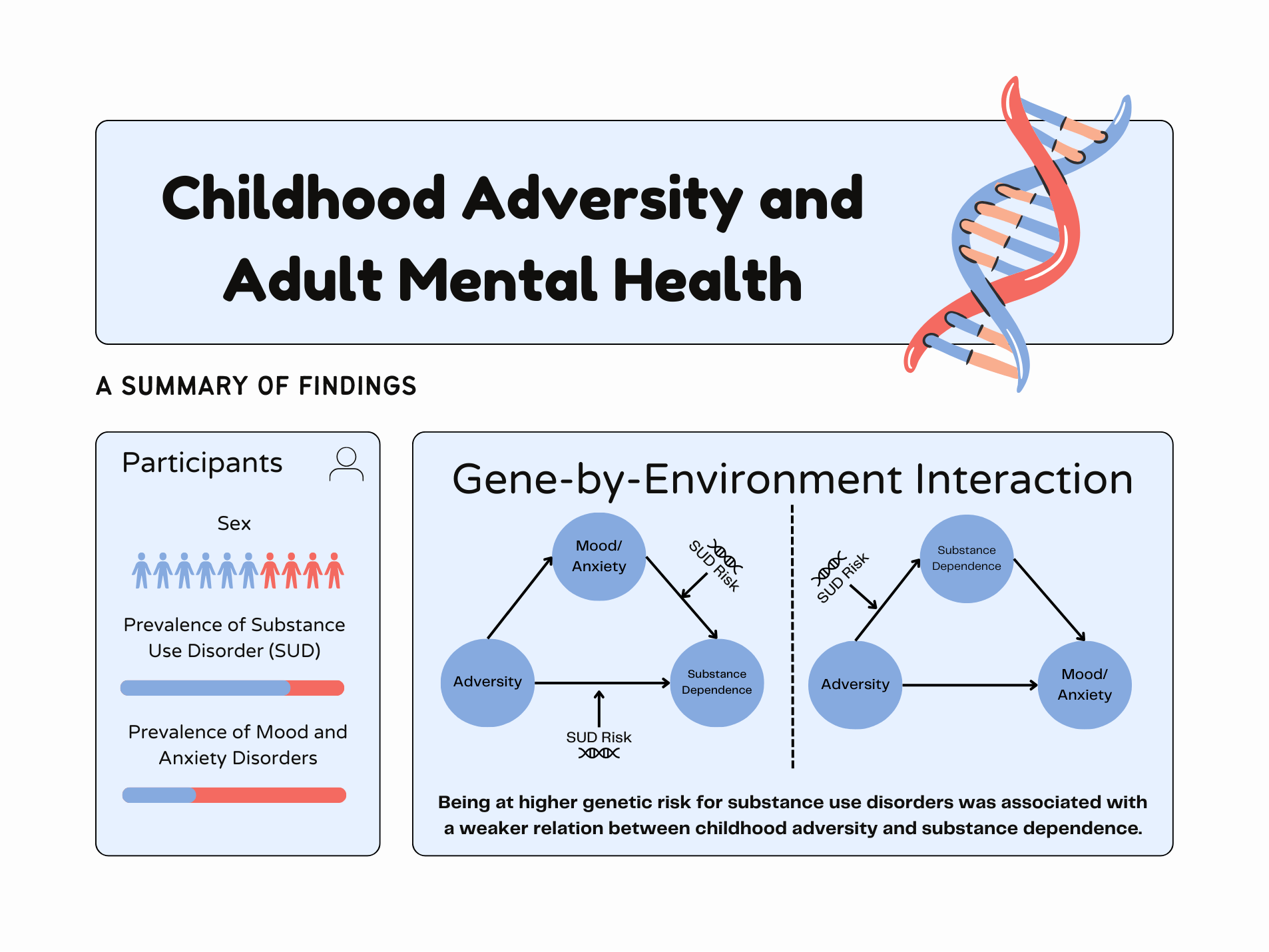 Despite the well-established link between childhood adversity and adult mental health disorders, many people with adverse childhood experiences do not develop a mental health or substance use disorder. The different outcomes among people may partially reflect genetic differences, as people vary in their genetic predisposition for developing these disorders. Among participants in our study, those with more genetic risk variants for substance use disorders were more likely to have a substance use disorder and at greater risk of developing a mood or anxiety disorder. A similar association was found among people with higher genetic risk for mood or anxiety disorders. Genetic risk for substance use disorders and mood or anxiety disorders also correlated with a higher likelihood of experiencing childhood adversity. Thus, we tested whether genetic differences in risk for these disorders interacted with adverse childhood experiences to influence adult mental health outcomes.