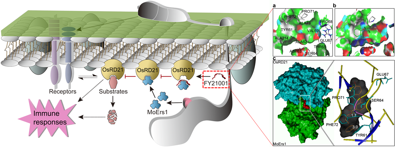 In summary, our studies revealed how synthetic compound FY21001 targeting M. oryzae-specific effector protein MoErs1 can be employed to control rice blasts (Fig. 2). Such an example opens up many possibilities for designing and developing novel fungicides that can effectively combat plant pathogens while minimizing environmental and animal health impacts.