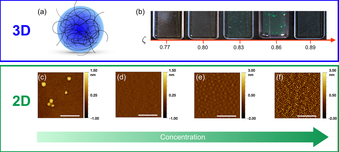 Fig. 1 (a) Sketch of a swollen ULC microgels in bulk. (b) Series of samples at different concentrations, generalized volume fration $\zeta$, showing liquid, crystal and glassy pahses. (c) - (f) AFM micrographs of ULC microgels at different concentrations, deposited on a solid substrate.