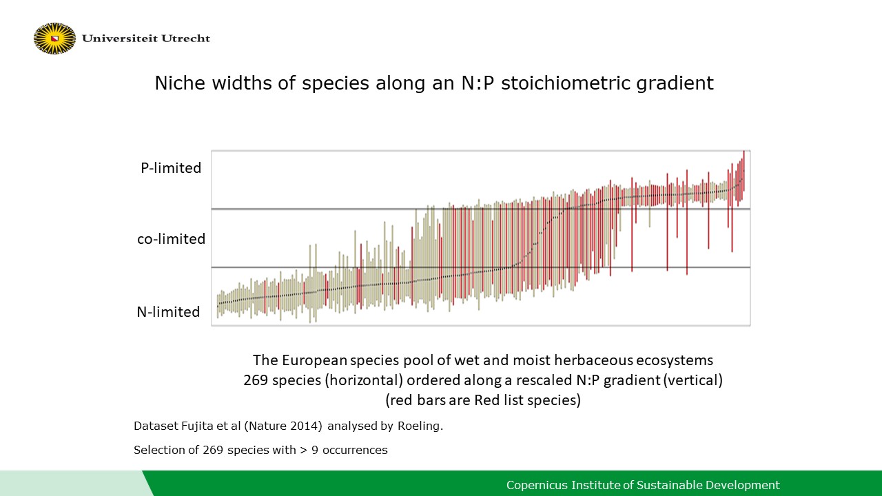 This triggered Jerry van Dijk, who joined the Environmental Sciences group as a new Assistant Professor at the time, to ask the question whether such stoichiometric imbalances, by influencing plant traits related to reproduction, dispersal and competition, could affect community assembly processes and lead to species turnover. Two new research projects were set up to study how plant investments in sexual reproduction traits, as well as the outcome of competitive interactions between species, changed along stoichiometric gradients. One of the projects also included a re-analysis of the 2014 dataset, now with a specific focus on community composition. The analysis, led by PhD candidate Ineke Roeling, showed that nutrient ratios explained a unique proportion of the variation in plant community composition and that there was considerable species turnover along the nitrogen to phosphorus ratio gradient described by the dataset. During one of the project meetings, the idea was coined that if that was the case, plant species might exhibit specific stoichiometric niches. To visualize this idea, Ineke created a figure that showed the individual distribution of 269 species (present in > 9 plots in the dataset) along the nitrogen to phosphorus gradient that confirmed the existence of species specific stoichiometric niches: