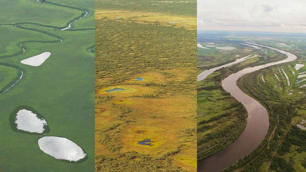 Helicopter views of studied ecosystems in western Siberia (left to right): fen (image Jochen Kassan), Great Vasyugan bog (the world’s largest intact peatland, image Elena Lapshina); Ob river near Novosibirsk (image Franziska Tanneberger).
