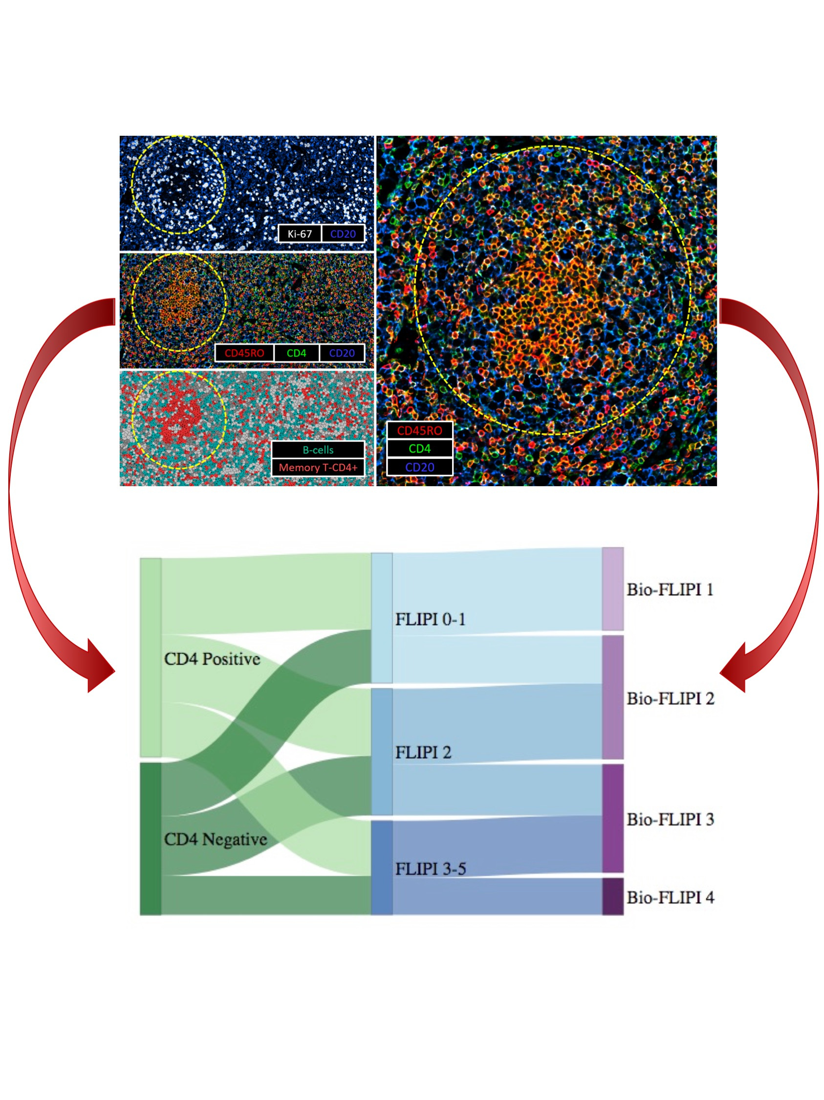 The BioFLIPI represents a promising predictor of treatment outcome in newly diagnosed FL patients that incorporates biological and clinical features, but it will need independent validation and eventually combination with genomic factors. While additional investigation to determine the mechanisms behind the reduced or absent expression of CD4+ T-cells inside the lymphoma follicles is warranted, the prognostic power of the BioFLIPI will be useful in the design of clinical trials as it identifies patients at the highest risk of early failure who may benefit most from more intensive therapies or novel frontline regimens.