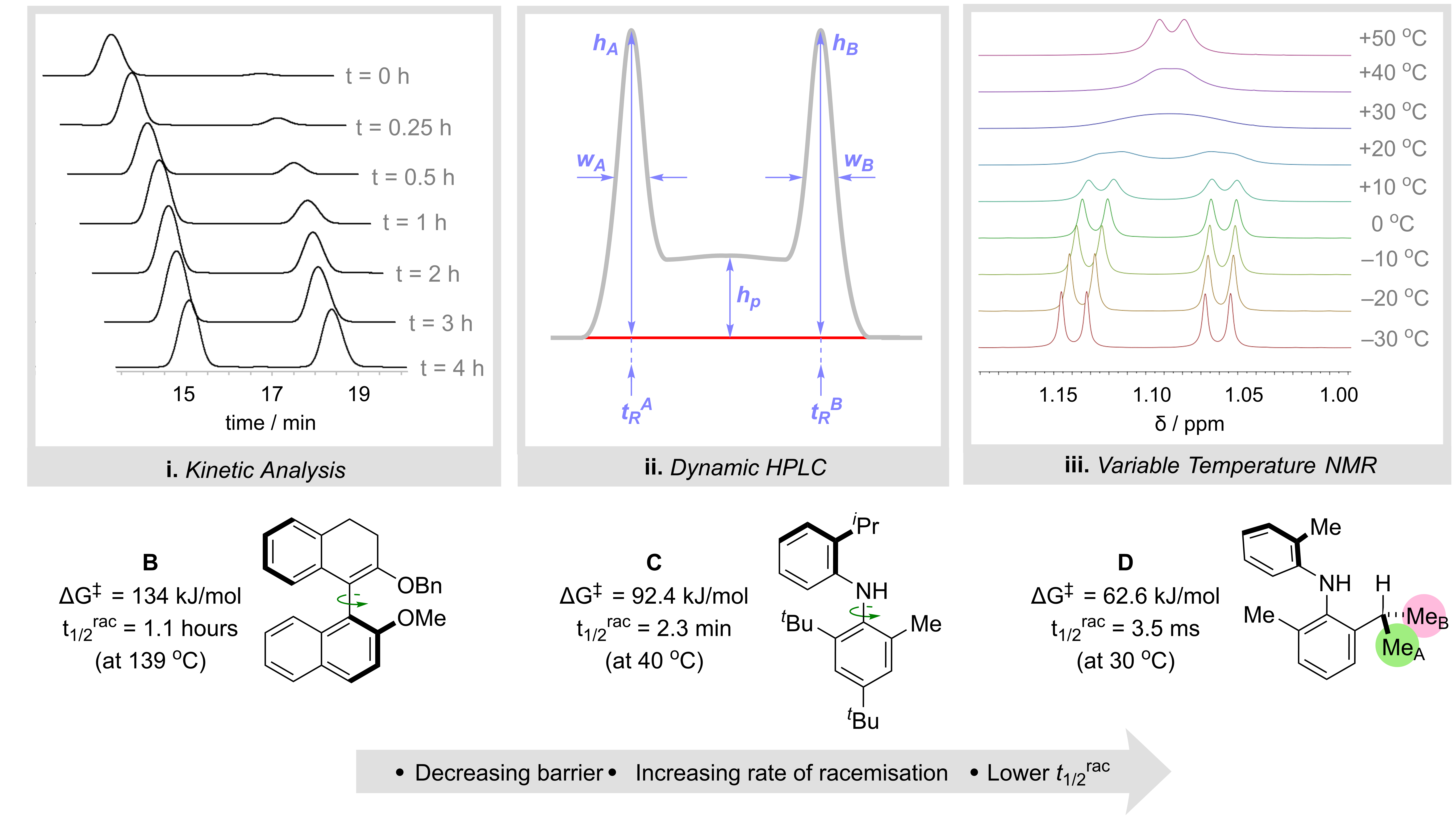 3. Variable Temperature NMR: Variable temperature NMR is a versatile method to determine the rate of conformational and chemical exchange processes. For atropisomeric molecules, a diagnostic feature is the coalescence of diastereotopic signals, which occurs when the rate of the racemization process is matched with the frequency difference between signals (Figure 3iii). The procedure is typically suitable for molecules in which racemization occurs relatively rapidly (ΔG‡ ≤ 85 kJ/mol). The rate of racemization can be calculated based on empirical determination of the coalescence temperature, or alternatively, lineshape analysis of spectra close to the coalescence temperature can be used to extract kinetic information directly. Our article discusses both of these techniques, using exemplar data from class 1 atropisomeric diarylamine D.