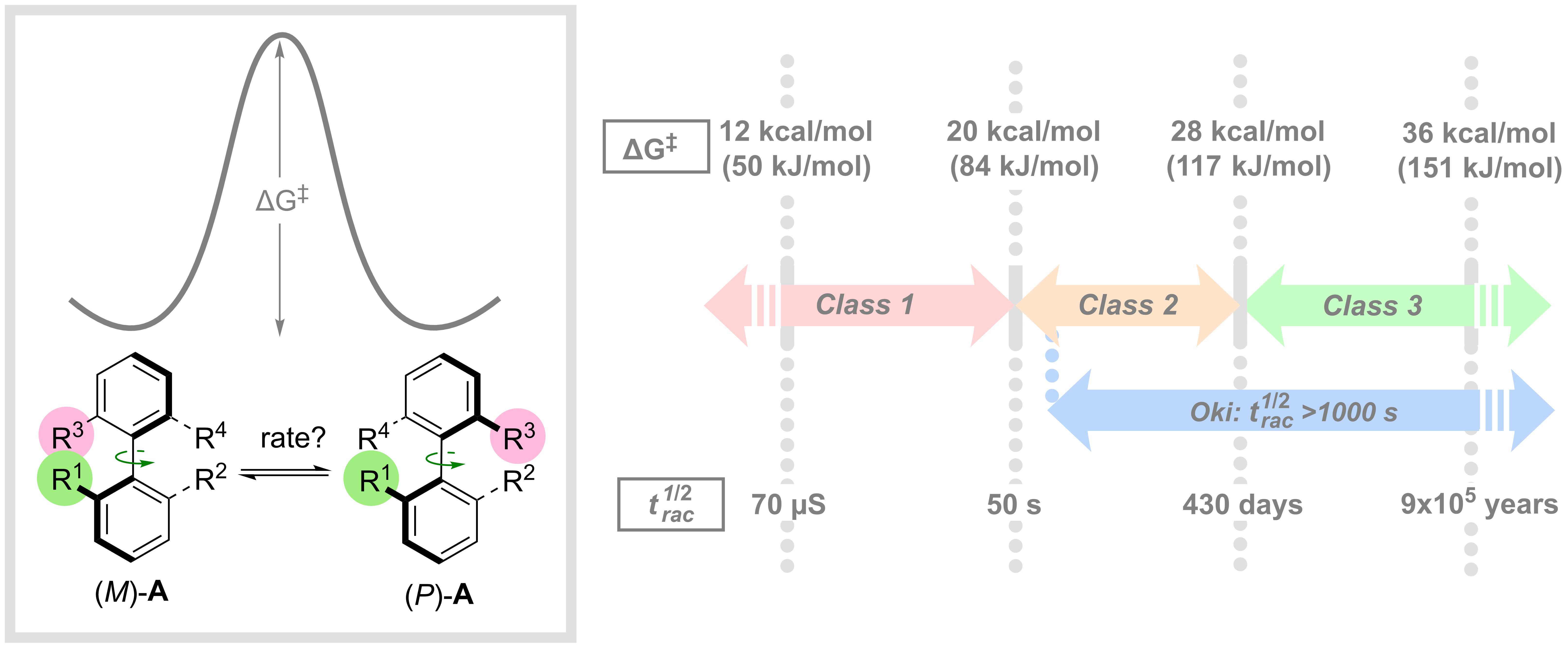 Figure 2 Enantiomerization of a generic atropisomeric biaryl and arbitrary definitions of atropisomerism according to racemization half-lives (t1/2rac) and free-energy barrier for enantiomerization (ΔG‡)