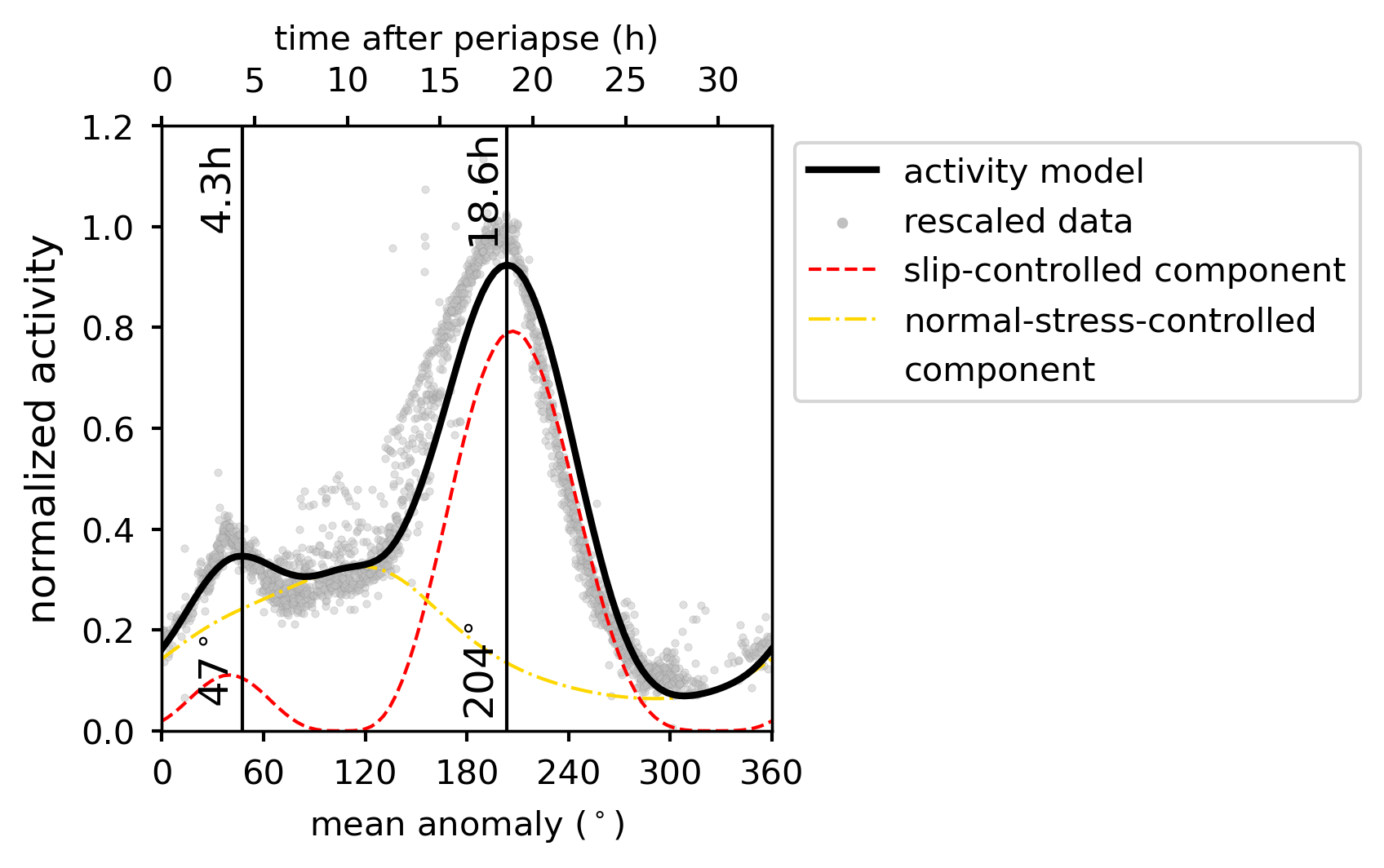 Fig. 3  Our activity model prediction (black solid line) compared to the rescaled data obtained by Cassini (grey dots) reveals the details of the Enceladean ``plumbing system''. The normalized activity signal, shown here as a function of the Enceladus’ position along the orbit, is composed of the slip-controlled (red dashed) and the normal-stress-controlled (gold dash-dotted) components. The former can explain the two peaks at around 40°-50° MA and 200° MA, while the latter can explain the ramp around 80°-140° MA and the increase of activity beyond 300° MA (MA denoting the mean anomaly with MA=0° corresponding to the pericenter).