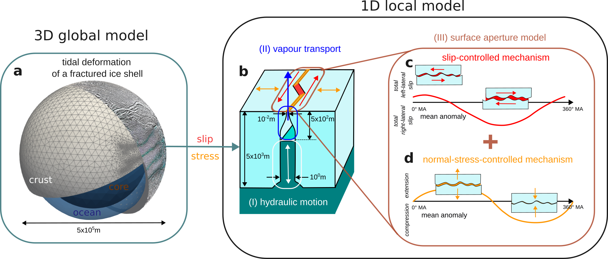 Fig. 2 Summary of our activity model for diurnal variations combining the global and local components. The 3D global model (panel a) describes the tidal deformation of a fractured ice shell with realistic thickness variations. Kinematic and dynamic quantities are averaged along the faults and over the depth across the shell and used as input for the local model. The local 1D model (panel b) combines a model for liquid water hydraulic motion (I, white), and a model for the transport of vapour and solid grains above the water table (II, blue) with a near-surface aperture model (III, brown) comprising two mechanisms: a slip-controlled mechanism corresponding to macroscopic jet flow (panel c) and a normal-stress-controlled mechanism corresponding to ambient (more diffuse) vapour flow (panel d). Numbers indicate the typical magnitude of the various length scales.
