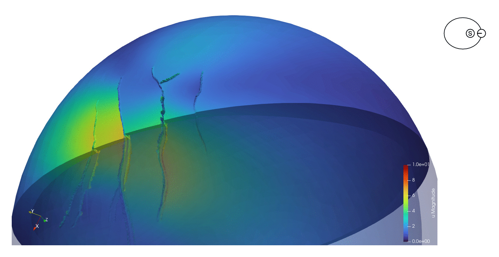 Fig. 1 Numerical simulation of the tidal deformation of Enceladus’ outer ice shell throughout its orbit around Saturn (exaggerated 1000x). The view is centered at the south pole, showing the prominent faults nicknamed “Tiger Stripes”. Colours indicate the magnitude of displacement.