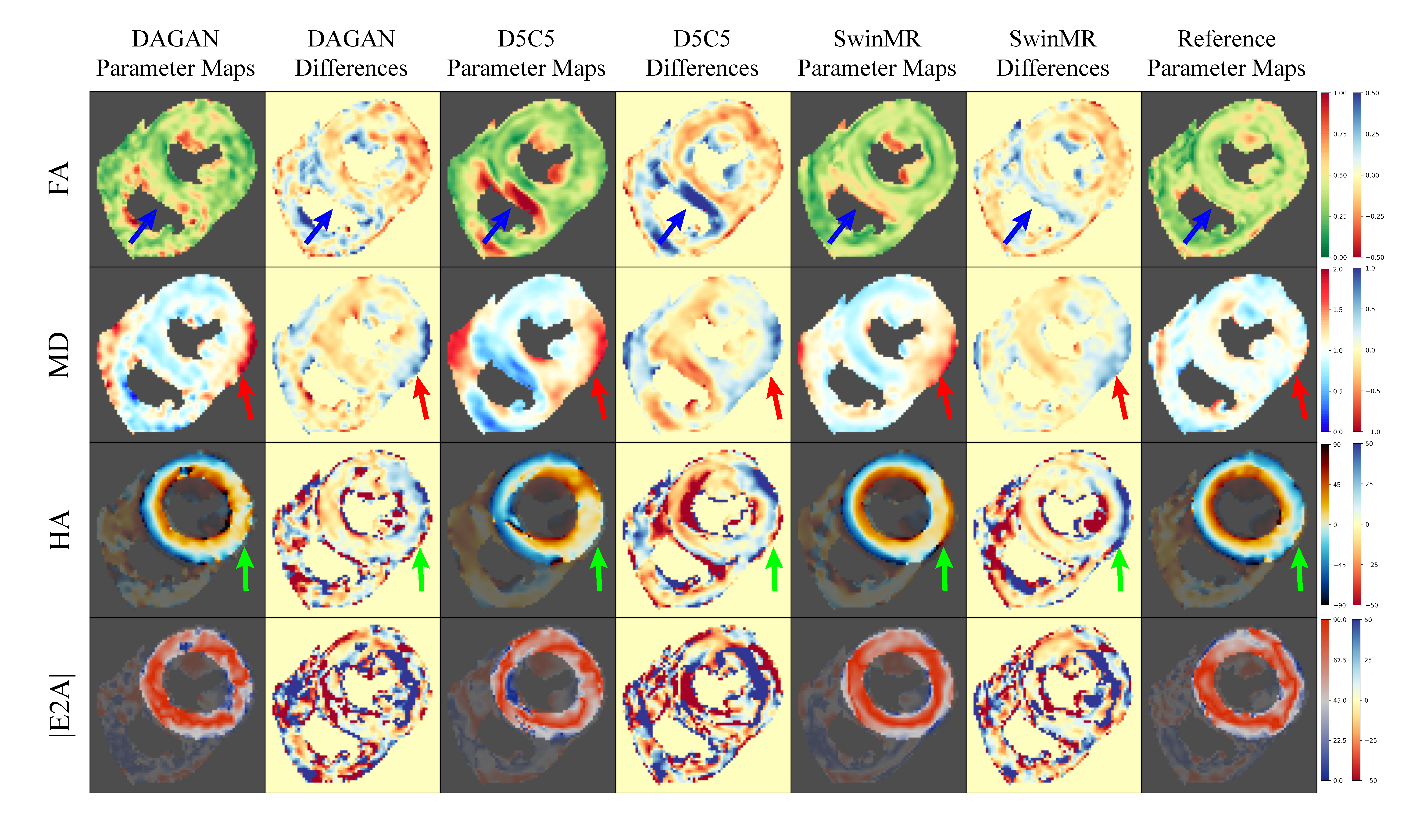 Second, our findings underscore a trade-off between perceptual performance and quantitative performance. The arrangement of myocardial fibres revealed by cDTI is influenced by the pixel intensity of DWIs, which reflects the actual physiological conditions. However, the models examined in this research were initially intended for structural MRI. In particular, DAGAN and SwinMR focused more on "perceptual-similarity", which can be seen as the distance in latent space. The perceptual loss used for training explicitly constrains the distance in latent space, while the adversarial learning mechanism implicitly minimises a statistical gap between two distributions in latent space. Therefore, future studies should focus on enhancing pixel-wise fidelity rather than perceptual similarity, or on preventing the introduction of artificial information.