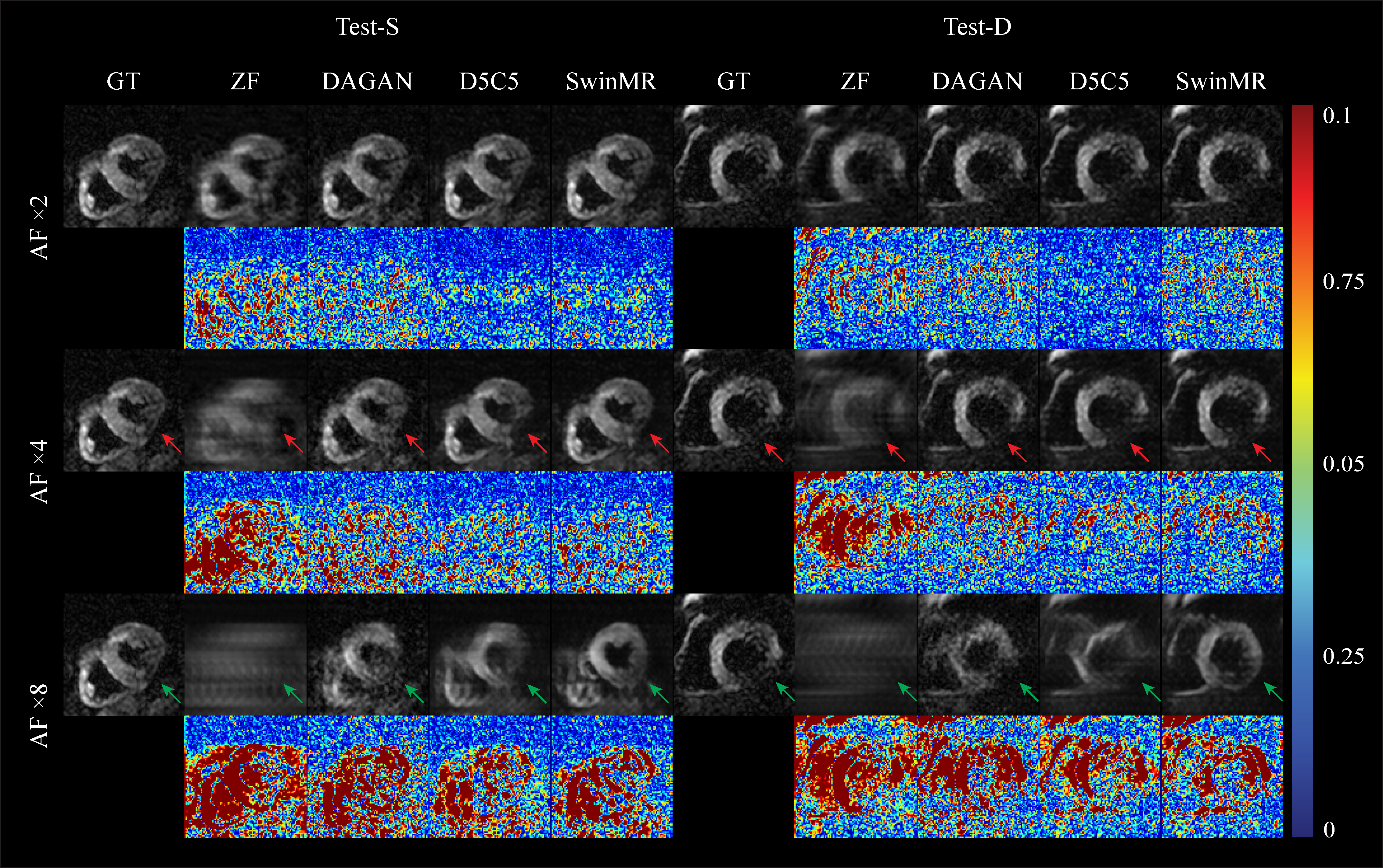 In the context of recovering the high-uncertainty region (green arrow in Figure.2), D5C5 successfully reconstructed the myocardium despite severe aliasing artefacts. DAGAN generated a reconstruction with low SNR and attempted to "in-paint" the missing myocardium based on its prior knowledge influenced by the adversarial learning process. SwinMR preserved most of the myocardium information, but the reconstruction was heavily affected by "fake" details (hallucination).