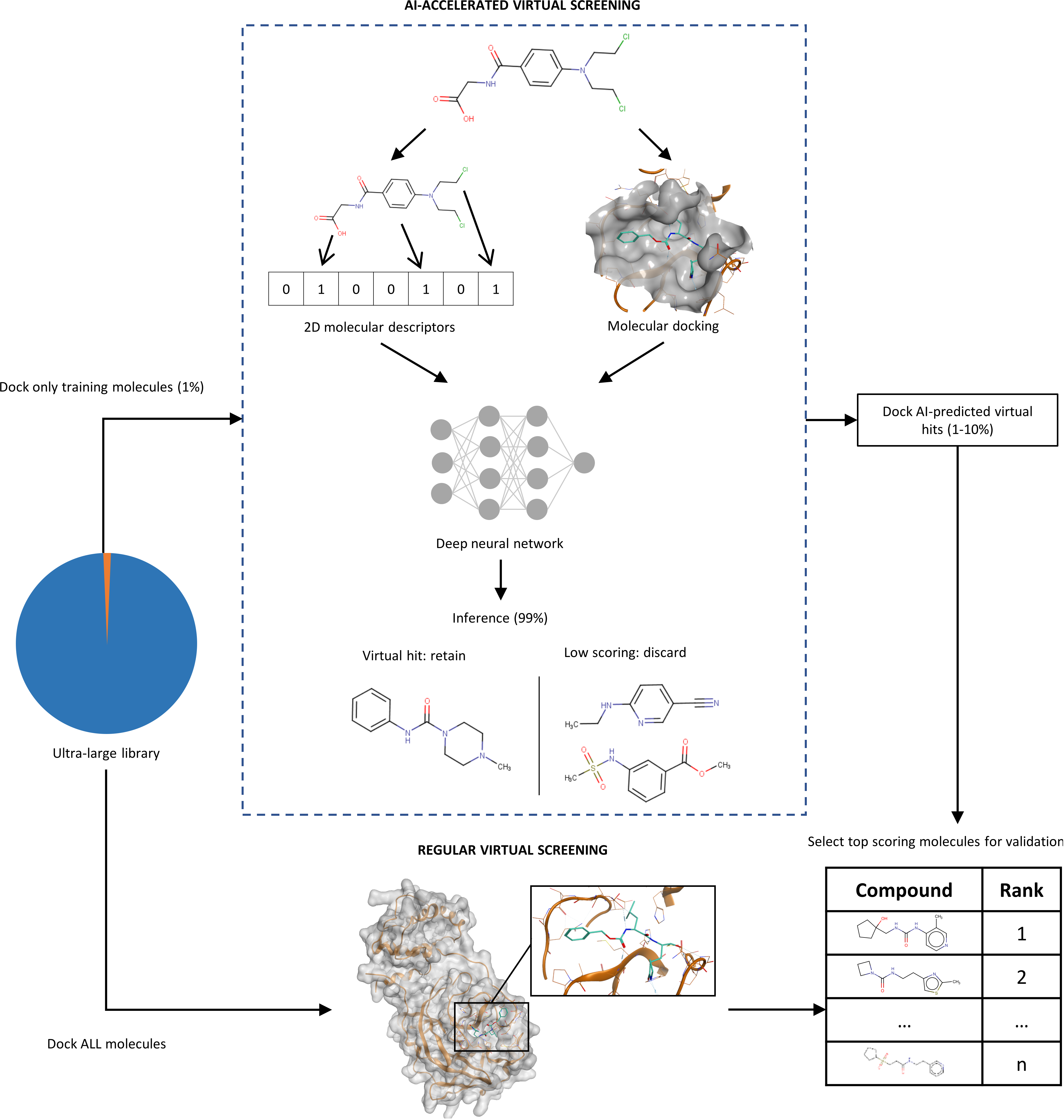 Figure 1. Schematic comparison of structure-based virtual screening performed with Deep Docking and conventional docking. Adapted from Gentile, F. et al, Nat. Protoc. 2022.
