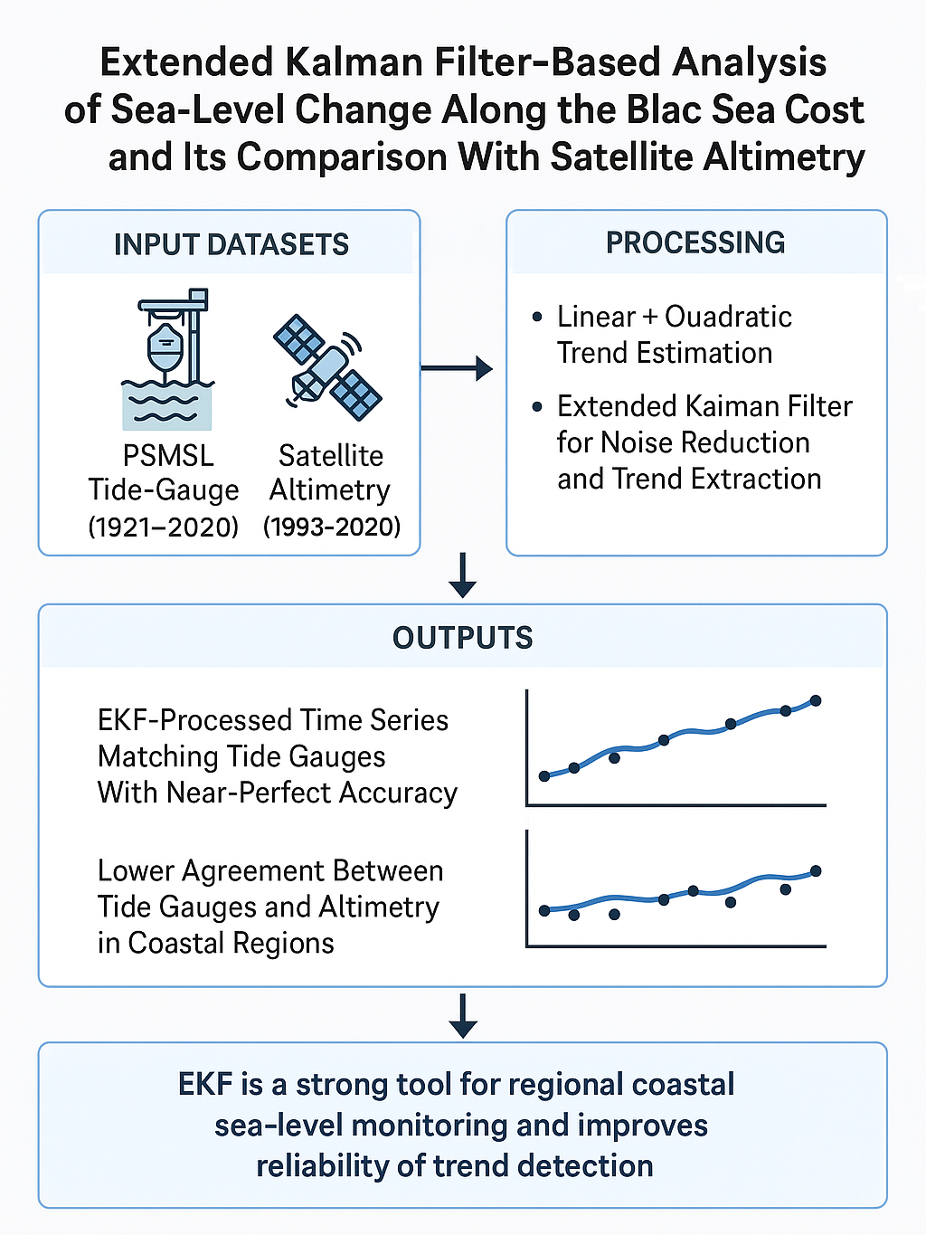 The main objective of this study was to analyse long-term sea-level variation in the Black Sea using PSMSL tide-gauge data and satellite altimetry, and to improve trend estimation using the Extended Kalman Filter (EKF). For this, PSMSL tide-gauge records from 10 stations (1921–2020) and satellite altimetry (GLORYS12V1 / CMEMS) for 1993–2020 were used. A linear and quadratic trend analysis was applied to detect long-term and accelerating changes, and an EKF state-space model was implemented to extract level, rate, and acceleration components.