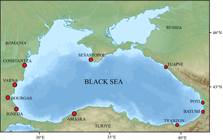 Data from 10 tide-gauge stations, including Amasra, Batumi, Bourgas, Constantza, Igneda, Poti, Sevastopol, Tuapse, Trabzon, and Varna, were analyzed (Fig. 1). These PSMSL datasets offer high-quality, century-scale records, while the GLORYS12V1 altimetry reanalysis (Copernicus Marine Service) provides complementary open-ocean coverage with 1/12° horizontal resolution and 50 vertical layers.