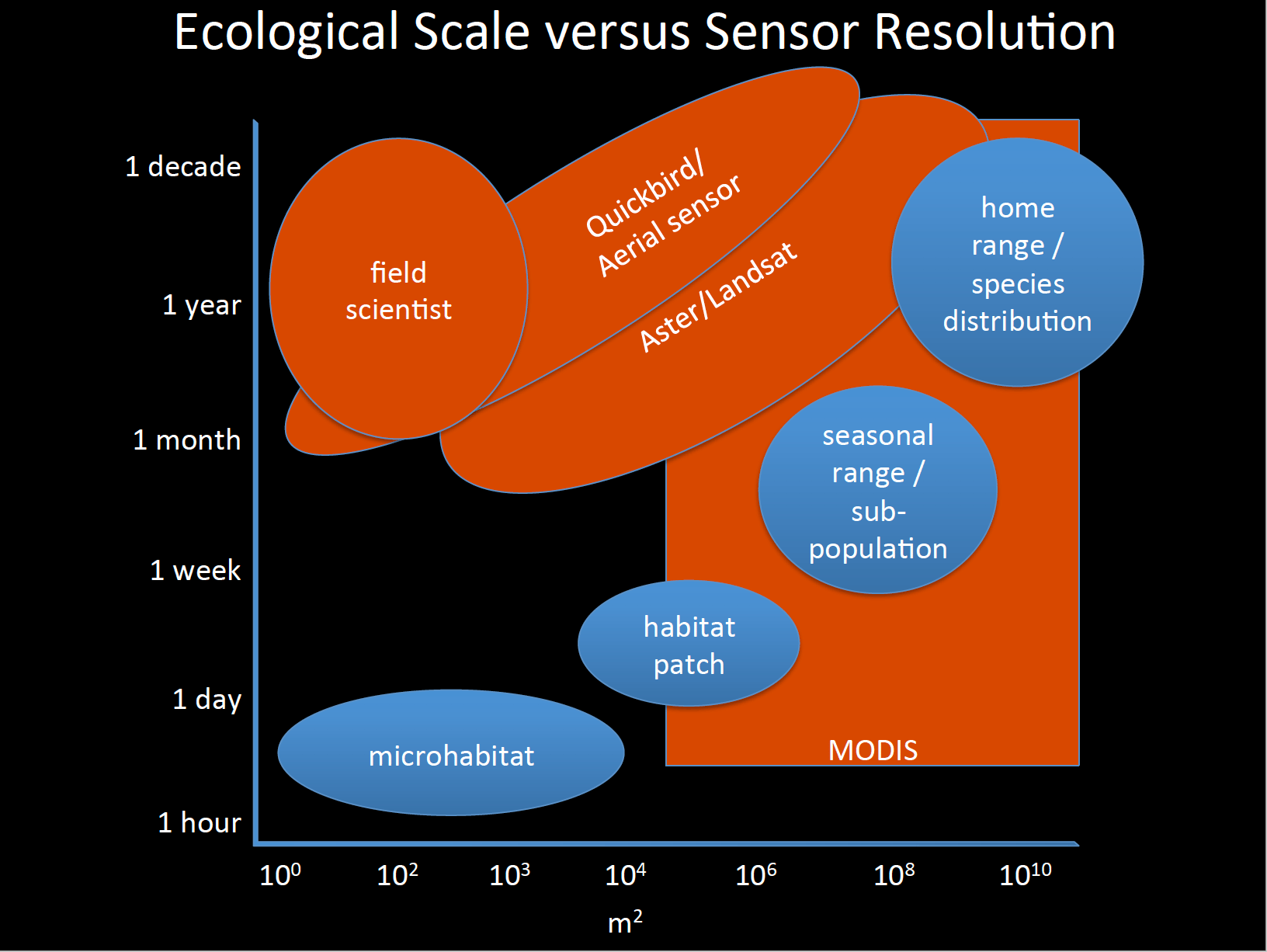 Our study arose from a clumsy attempt to illustrate such observational gaps. In 2012, I (Lyndon) visited NASA’s Jet Propulsion Lab with co-author Kelly Caylor to explore collaborations on using unmanned aerial vehicles (UAVs) for ecological research. In a presentation of our ideas, I included a hastily sketched figure (Figure 1).