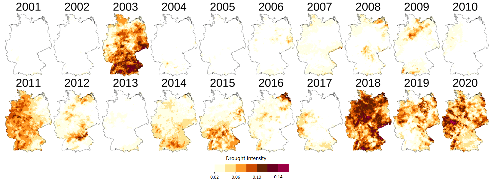 Figure 1. Germany topsoil water conditions (5–25 cm depth) from April to October during 2001–2020. UFZ Drought Monitor / Helmholtz Centre for Environmental Research (UFZ) (https://www.ufz.de/index.php?de=37937).
