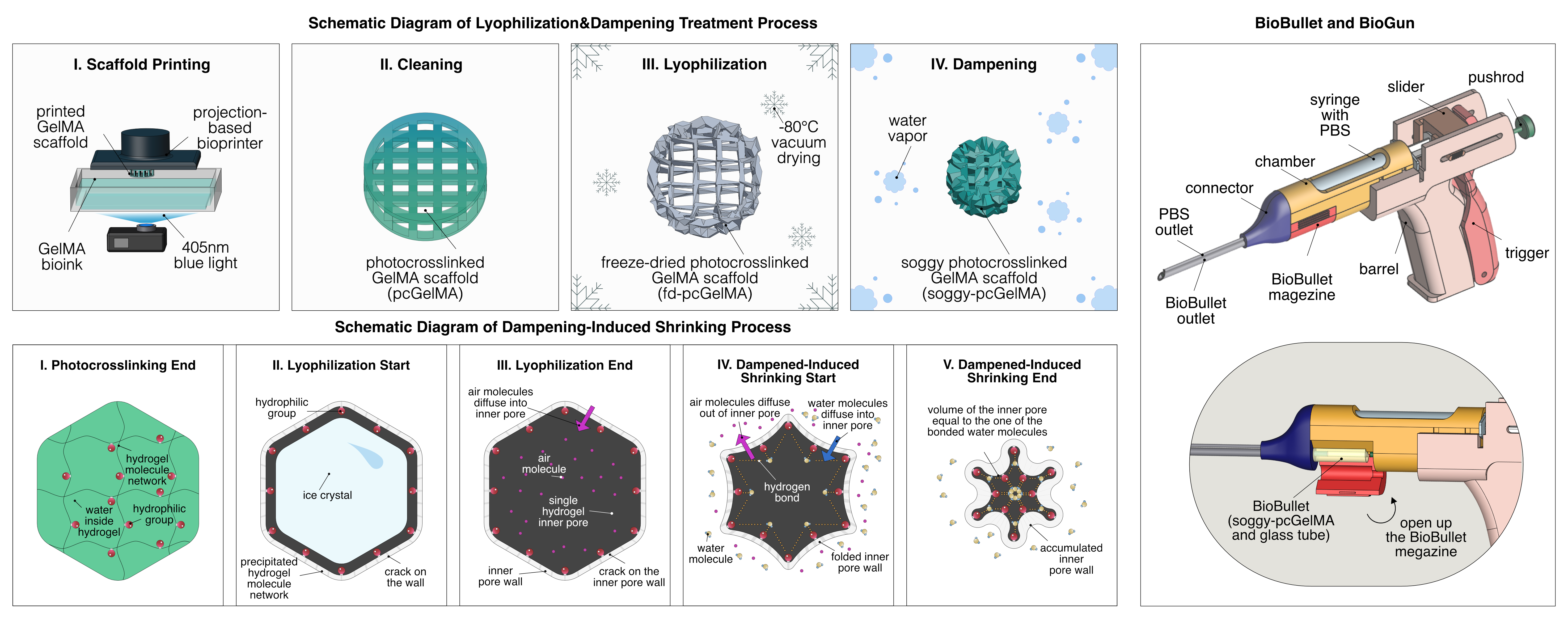 As mentioned in the main text of the paper, we proposed the "lyophilization + dampening" hydrogel scaffold treatment method and applied it to the scenario combining hydrogel scaffolds with minimally invasive surgeries. Compared to hydrogel fluids or solid bulk without special topological structures, the macroscopic grid structure of 3D-printed hydrogel scaffolds provides a more extensive nutrition exchange network and growth space for cells in the body, accelerating tissue defect repair. However, traditional hydrogel scaffold implantation often requires larger skin incisions, leaving scars and causing significant bleeding. By first reducing the volume of the hydrogel scaffold through the "lyophilization + dampening" method and then injecting it subcutaneously through minimally invasive means using specially designed "BioBullet" and "BioGun", these issues can be perfectly resolved. This strategy holds significant potential for clinical applications in the future.