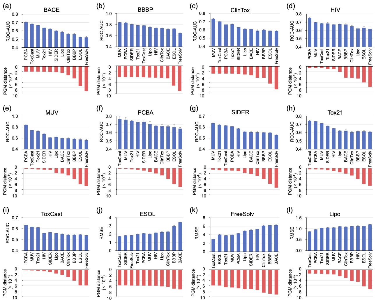 We evaluate PGM thoroughly on 12 benchmark datasets from MoleculeNet with various molecular property prediction tasks. We build a quantitative transferability map to intuitively observe the task-relatedness between these molecular property prediction datasets. Then we perform a transferability map-guided cross-task transfer learning strategy. Specifically, each of the 12 datasets is used as the target dataset, while the remaining 11 datasets are employed as source datasets, as described below. Initially, the model is trained on each source dataset to obtain pre-trained models. Subsequently, each of these pre-trained models is fine-tuned on the target dataset. As depicted in Figure 2, a significant correlation between the predicted transferability and the transfer learning performance across various tasks can be observed.