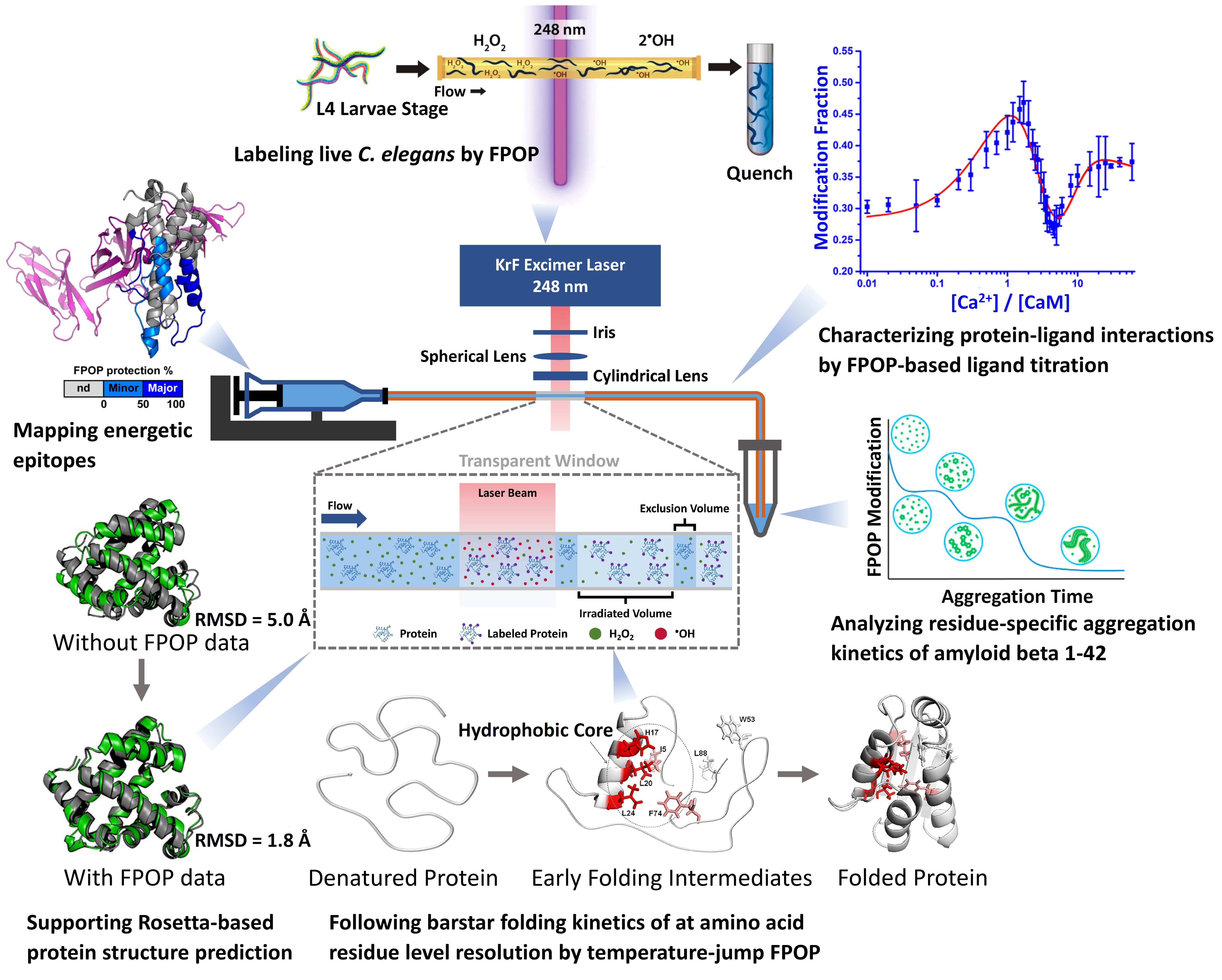 Since its introduction, FPOP has been widely adopted to address significant biological needs including tracing protein folding/unfolding, mapping epitopes, labeling in vivo, assessing protein aggregation, understanding protein-ligand interactions, and assisting protein structural prediction (Figure 1). It is also adopted by biotechnology companies because adverse drug reactions, caused by changes in HOS, impact the safety and efficacy of protein therapeutics. Current tools to monitor HOS are either too slow or too low in spatial resolution.