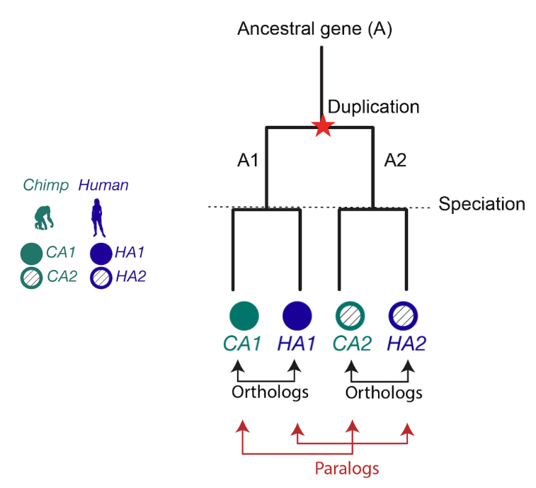 Figure 1. The relationship between two genes that share a common ancestor is called homologous, from the Greek word homologos— homos (meaning “same”) + logos (meaning “relation”). Orthologs are gene pairs that diverged due to evolutionary speciation, while paralogs are gene pairs that diverged due to a duplication event. This distinction is important because orthologs tend to have similar functions, but paralogs do not.