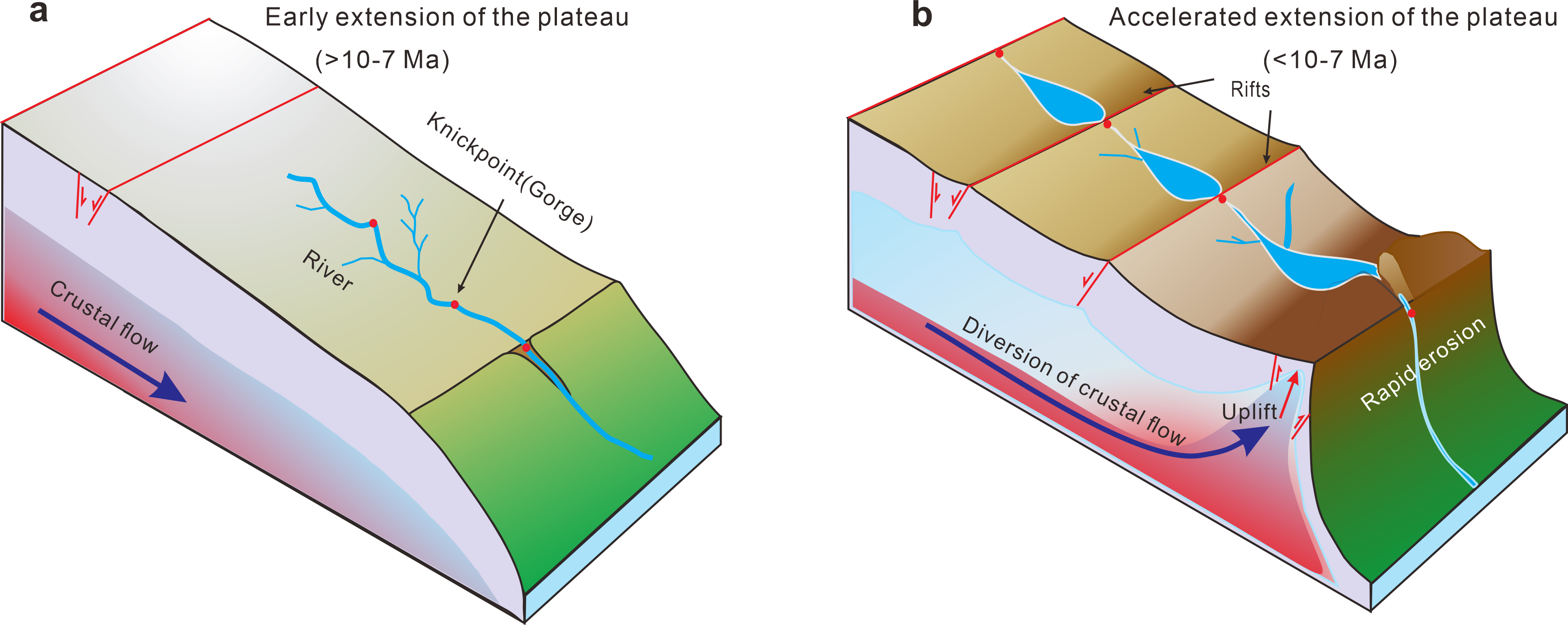 Fig. 2 Schematic diagram illustrating the mechanisms for tectonic activity impeding the river incision. (a) Headwater incision of the river related to the uplift of the southeastern Tibetan Plateau along with intensified monsoon precipitation. (b) Regional coupled tectonic systems with accelerated extension of the plateau driving the formation of river knickpoints, which subsequently adjusts and reduces the regional river gradient, keeping river knickpoints relatively stable and slowing down upstream river incision.