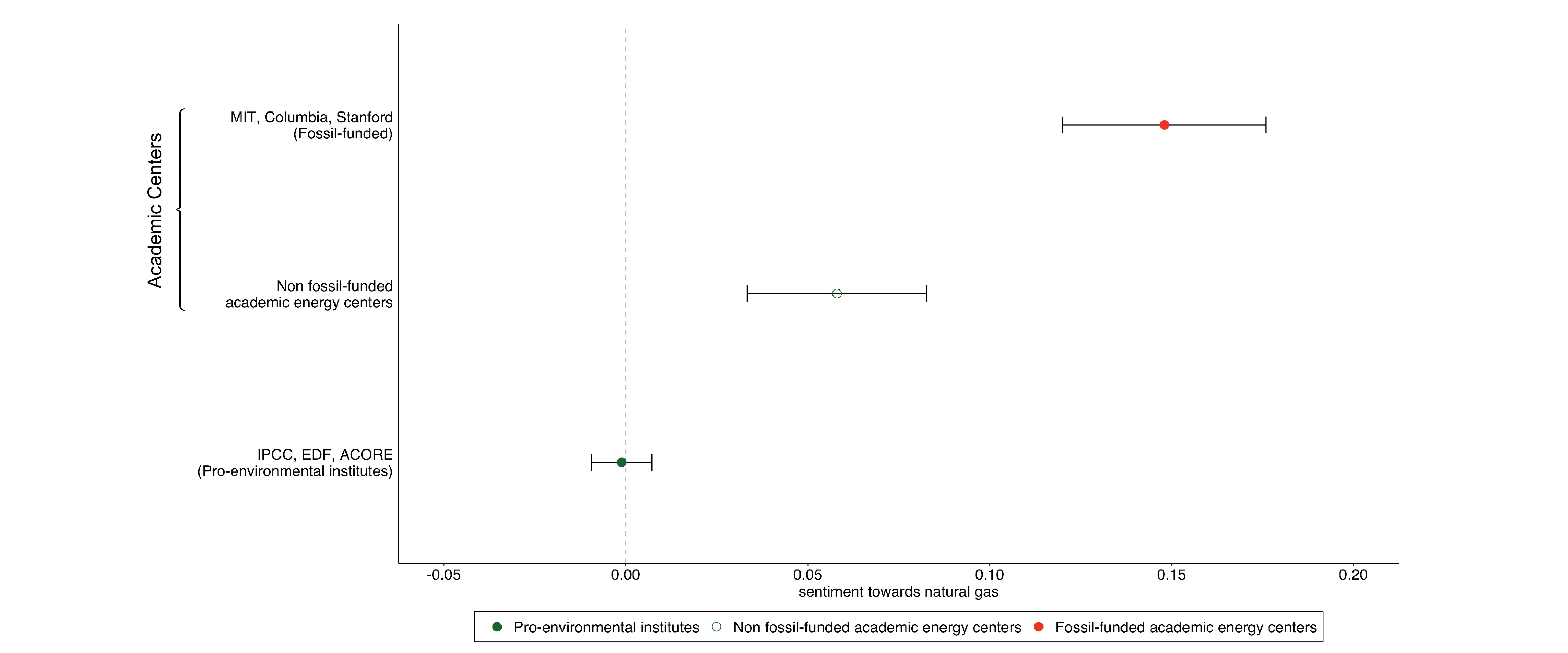 We find that energy centers heavily funded by fossil fuel companies write text that is significantly more positive in mentions of natural gas. We are the first to quantify this favorability, which dwarfs the preference expressed towards renewable energy sources such as wind and hydro power. Indeed, fossil-funded academic centers are just as positive towards natural gas as industry groups like the American Gas Association and the American Gas Foundation, whose explicit mission is to promote natural gas. At academic centers less dependent on fossil donations, solar and hydro power generate a more positive sentiment than gas.