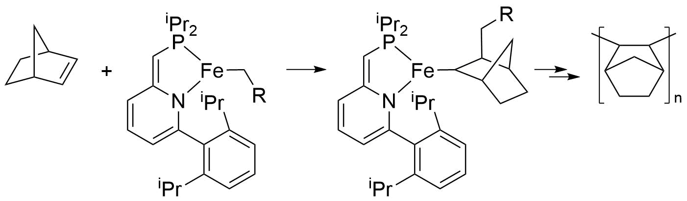 During the detective work, there was a polymer that often forms in high yield when I use Fe(II) precursors, and I could not obtain 1H NMR of it due to insolubility. Considering the precedence of Fe(II)-alkyl catalyzed addition polymerization, I thought that it is the undesired addition polymerization polynorbornene that has low solubility, unlike ROMP polynorbornene (Figure 4).