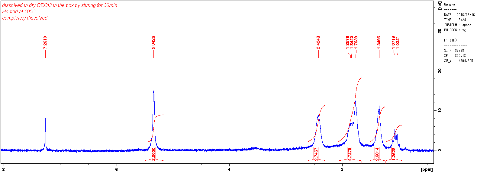 On June 16, 2016, a month before the end of my postdoc contract, I took the polymer for NMR analysis. I noticed that the polymer became brittle while standing on the bench for two months. The brittle polymer was soluble in CDCl3, and to my surprise, and explosion of excitement, the 1H NMR showed spectra of ROMP polymer !!! (Figure 6) I rushed into David's office.