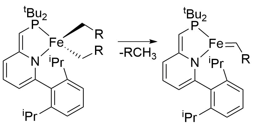 Soon, we found that we can not make the carbene complex using a diazo compound, as it oxidizes the phosphine ligands, as observed by Grubbs, who pioneered this captivating challenge of Fe-catalyzed olefin metathesis decads ago. After a year of failure, we managed to isolate an iron-carbene complex using a different ligand set. However, as is the case of other isolable Fe-carbene complexes (examples), it did not show olefin metathesis reactivity. After another year of failure, I gave up on this method and started to examine an alpha-H elimination method using Fe(III)-alkyl complexes (Figure 3).
