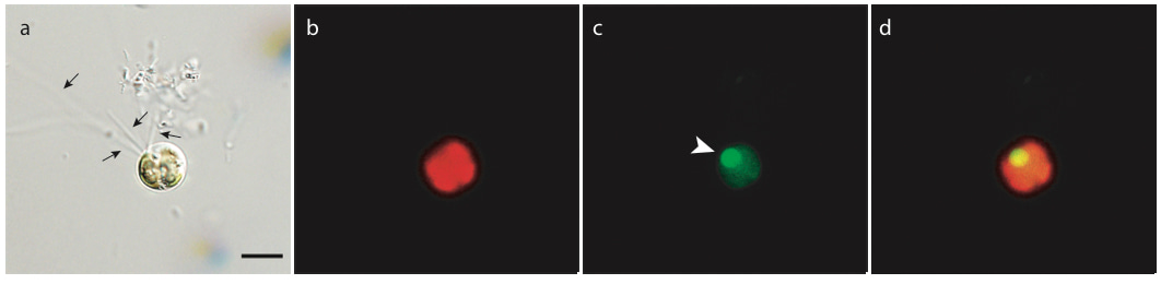 In all, we were able to confirm feeding in five strains of green algae (banner image, figure 2), highlighting important sources of methodological bias that could contribute to underestimates of mixotrophic feeding and corroborating the predictions of the gene-based model of Burns et al. (2018). Our results demonstrate the potential for widespread mixotrophy across green algae, and also set the stage for future experimental work to further illuminate the importance of algal phago-mixotrophy at global scales.