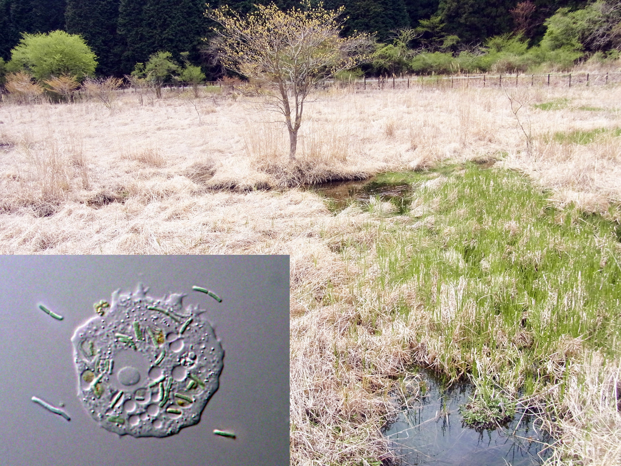The first thing to do was to obtain predators feeding on unicellular algae. Among ciliates, flagellates, and amoebae as well known algal grazers, Akihiro chose amoebae. The reason was just that he loved slowly moving organisms for microscopic inspection but this choice, in the end, offered us an opportunity to compare organisms of different lineages as explained below. Then, we searched amoebae in databases of culture collections and found some strains. However, these amoebae had been cultivated with bacterial prey such as E. coli for a long time and it was unclear what kind of prey they fed on in the wild. That was why we went to a marsh which was sunny, shallow, and rich in algae. There, amoebae feeding on algae were well exposed to sunlight. As a result, he succeeded in isolating three kinds of amoebae (two belong to Amoebozoa, one to Excavata). Excavata and Amoebozoa are two distinct eukaryotic supergroups, so these amoebae are distantly related. Thus, we happened to be able to get insights into the generality and diversity in the effects of preys’ photosynthetic traits on predators in this study.