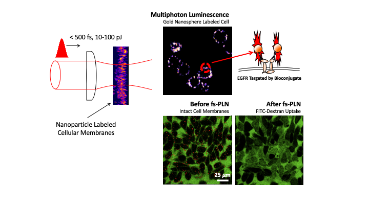 As with many scientific inquiries, first experimental results came unexpectedly. While we rather quickly confirmed EGFR conjugation to the gold nanoparticle surface with spectroscopy, many months were spent unsuccessfully looking at dark images void of any multiphoton luminescence signal. On the chance multiphoton luminescence was observed, it did not present in the characteristic ring pattern associated with targeted surface EGFR labeling. Ironically, it’s these moments the U2 song “I still haven’t found what I’m looking for” seems to invariably get stuck in one’s head. As the conjugation protocol can take a hefty 8-hours to complete, at some point, frustration can and did start to set in. When this point came, we abandoned our perceived understandings and incubated cells with what we thought to be a high concentration bioconjugate solution. With this simple change, suddenly rings of strong multiphoton luminescence were displaying upon laser excitation. Highly encouraged, membrane impermeable FITC-Dextran was added to the extracellular space and we proceeded to pummel three square regions of cells with 10s of mW of laser energy. After a quick wash, cells were transferred to a standard epifluorescent microscope, where we excitedly viewed three well-defined and highly fluorescent squares of cells. Apart from those three squares, no other cells fluoresced. Success! these cells were optoporated! – and yes, this warranted a celebratory trip to the local pub for a round of beers. From this point we were able to refine our labeling and optoporation experiments to elucidate the relationship of laser fluence and FITC-Dextran uptake in cells exhibiting randomly clustered nanoparticles along its surface. Great measures were taken to directly track individual cells and prevent wash off throughout each experiment. To this end, we developed a new method ensuring cellular adherence to glass surfaces and protocols were designed such that extracellular FITC-Dextran could be dispensed and washed without moving the sample from multiphoton microscope. Optoporation efficiency was shown to depend on labeling concentration as well as the naturally occurring EGFR endocytic trafficking cycle. Finally, we revealed fs-PLN at the 80 MHz laser rep rate is based on the formation and accumulation of long-lived ROS.