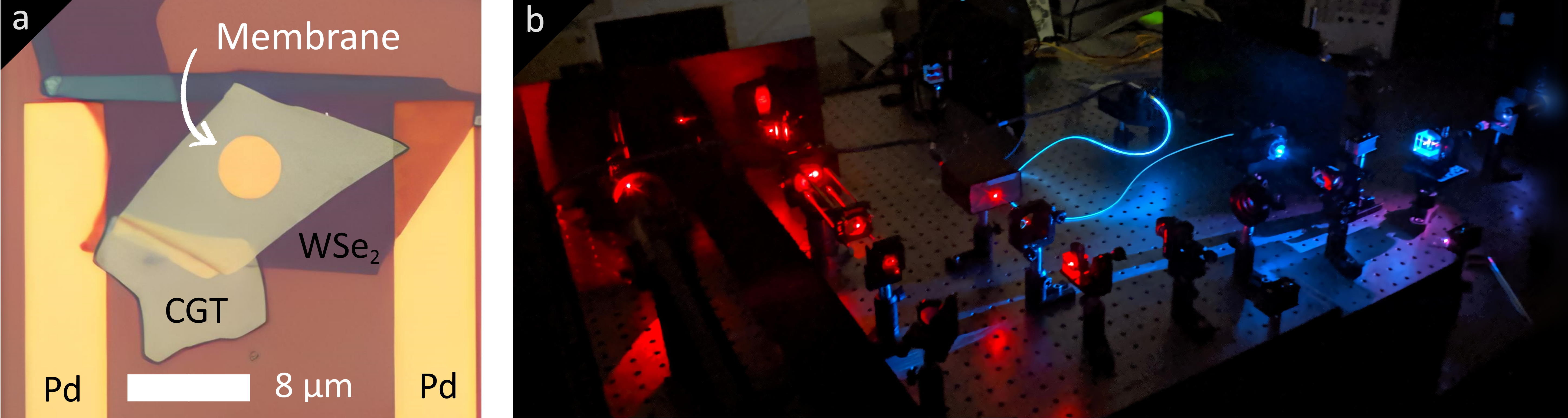 We suspend layers of CGT over micron-sized cavities in Si-based substrates, forming ultrathin nanodrums (Fig. 1a). We fabricate these drums using both layers of only bare CGT and heterostructures made of stacks of CGT with other 2D materials. We ensure that the suspended layers are placed on top of electrodes for electric field application.