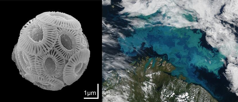 Figure 1. Left side: The coccolithophore Emiliania huxleyi. Coccolithophores cover themselves with a shell composed of miniscule calcitic scales which they form intra-cellulary. Photo: Lennart Bach, taken with support of Dr. Sebastian Meier at the Institute of Geosciences at the University of KielRight side: A bloom of E. huxleyi in the Barents Sea. Photo: Jeff Schmaltz, MODIS Rapid Response Team at NASA GSFC / NASA’s Earth Observatory.