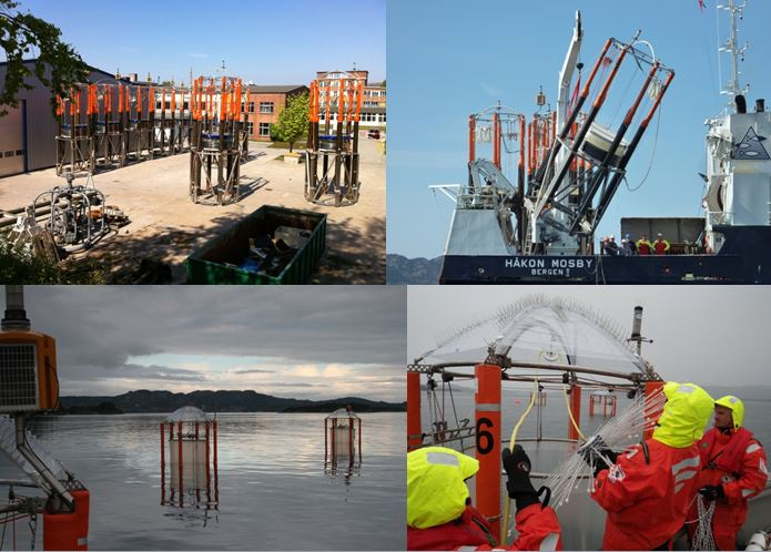 Figure 3. Top left: Kiel Offshore Mesocosms for Future Ocean Simulations (KOSMOS) ready for transport to Norway. Top right: Deployment of one KOSMOS unit in Raunefjord by the Norwegian research vessel Hakon Mosby. Photos: Ulf Riebesell. Bottom left: Three of nine KOSMOS units moored in Raunefjord. Photo: Lennart Bach. Bottom right: CO2 manipulation in KOSMOS 6. Photo: Signe Klavsen.
