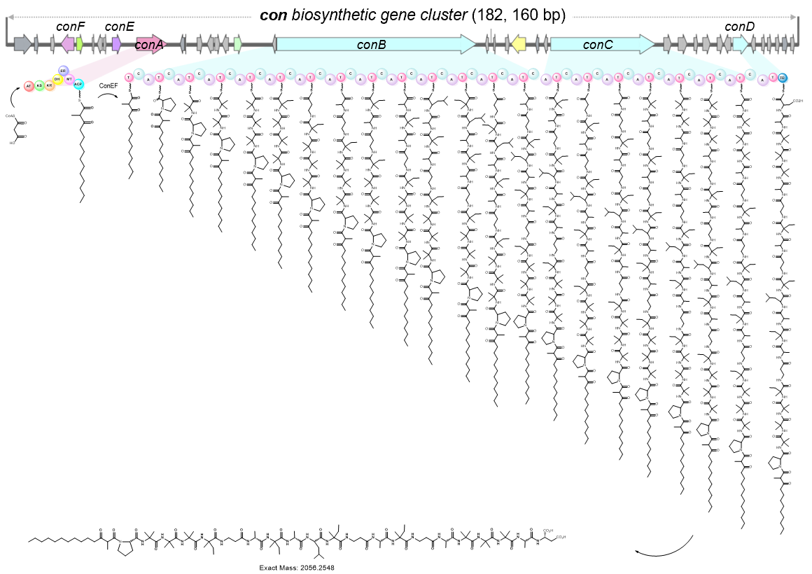 We are eager to move coniotins along the development pathway. The next steps include producing it at scale through fermentation and formulating the new drug class so that it may eventually be suitable for intravenous (IV) delivery. Excitingly, we’ve already decoded the biosynthetic pathway in C. hoffmannii, which opens the door to scalable, engineered production (Figure 4). This not only enables practical drug development but also contributes to our understanding of how fungi naturally produce complex lipopetaibiotics.