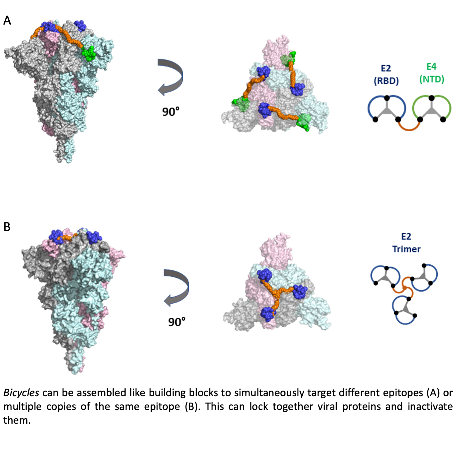This new class of antiviral exploits molecules called Bicycles - short peptides wrapped around a small molecule scaffold to form a two looped “bi-cyclic” structure. As well as being highly potent, selective and stable, new Bicycles can be generated quickly in a manner analogous with how our bodies make new antibodies. To make an antiviral Bicycle against SARS-CoV-2, the team used a technology called ‘Phage Display’ (developed by Sir Greg Winter, for which he shared the 2018 Nobel Prize in Chemistry) to select molecules capable of binding the viral spike protein from a pool of billions of differently shaped molecules. The team responded to this urgent situation, identifying the first Bicycle binders within 4 weeks. Unlike antibodies, which tend to recognize only parts of a protein surface, Bicycles’ small size meant that molecules were found against almost every part of the spike protein.