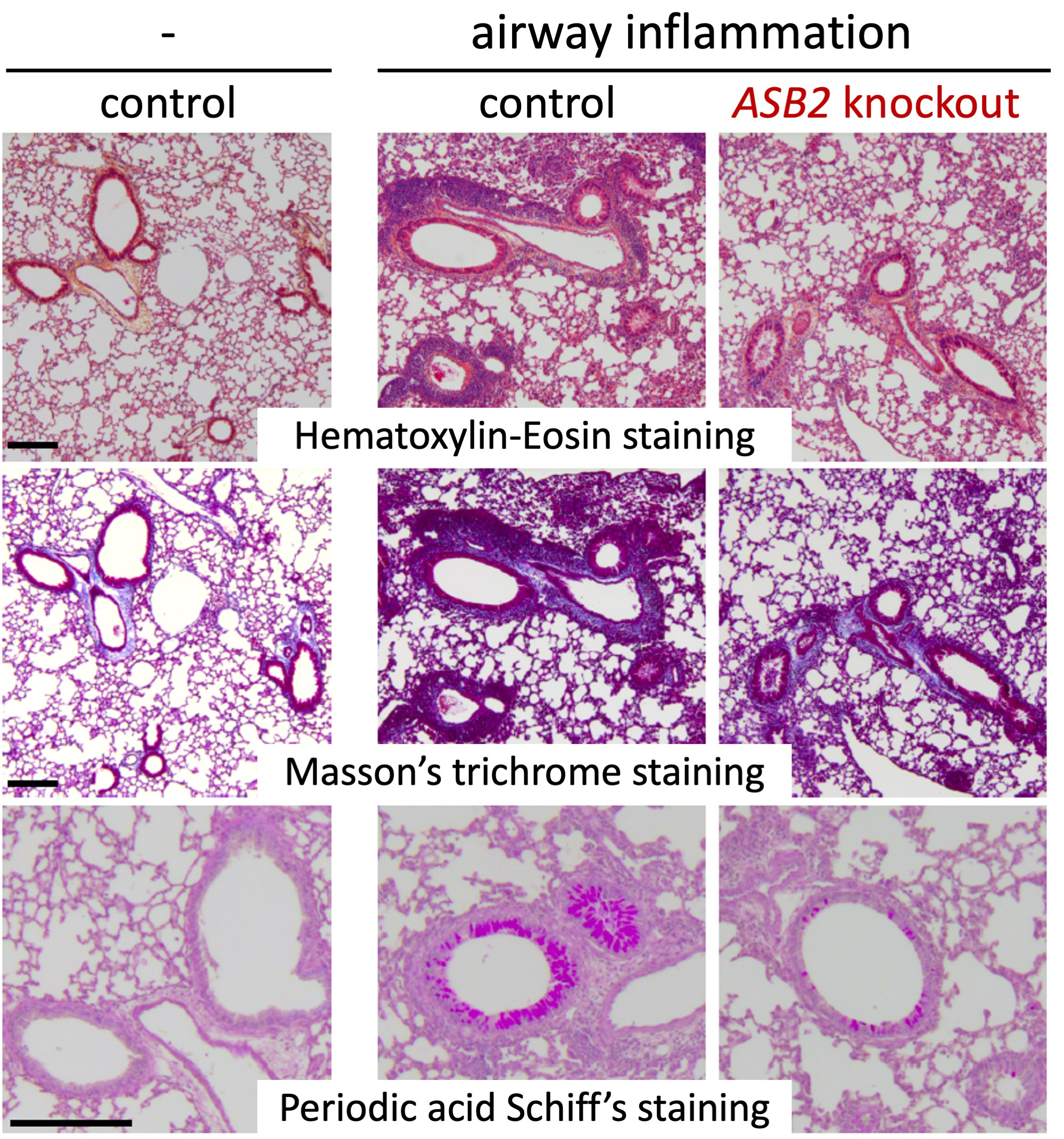 Deletion of ASB2 attenuates airway inflammation in mice. Control and ASB2 knockout mice were submitted to airway inflammation or treated with PBS (-). Compared to control mice, induction of airway inflammation in ASB2 knockout mice resulted in decreased immune cell infiltration determined by hematoxylin-eosin staining of lung sections, decreased remodeling of the airways evaluated by collagen deposits after Masson’s trichrome (MT) staining of lung sections, and decreased mucus secretion assessed after Periodic Acid Schiff’s staining of lung sections.